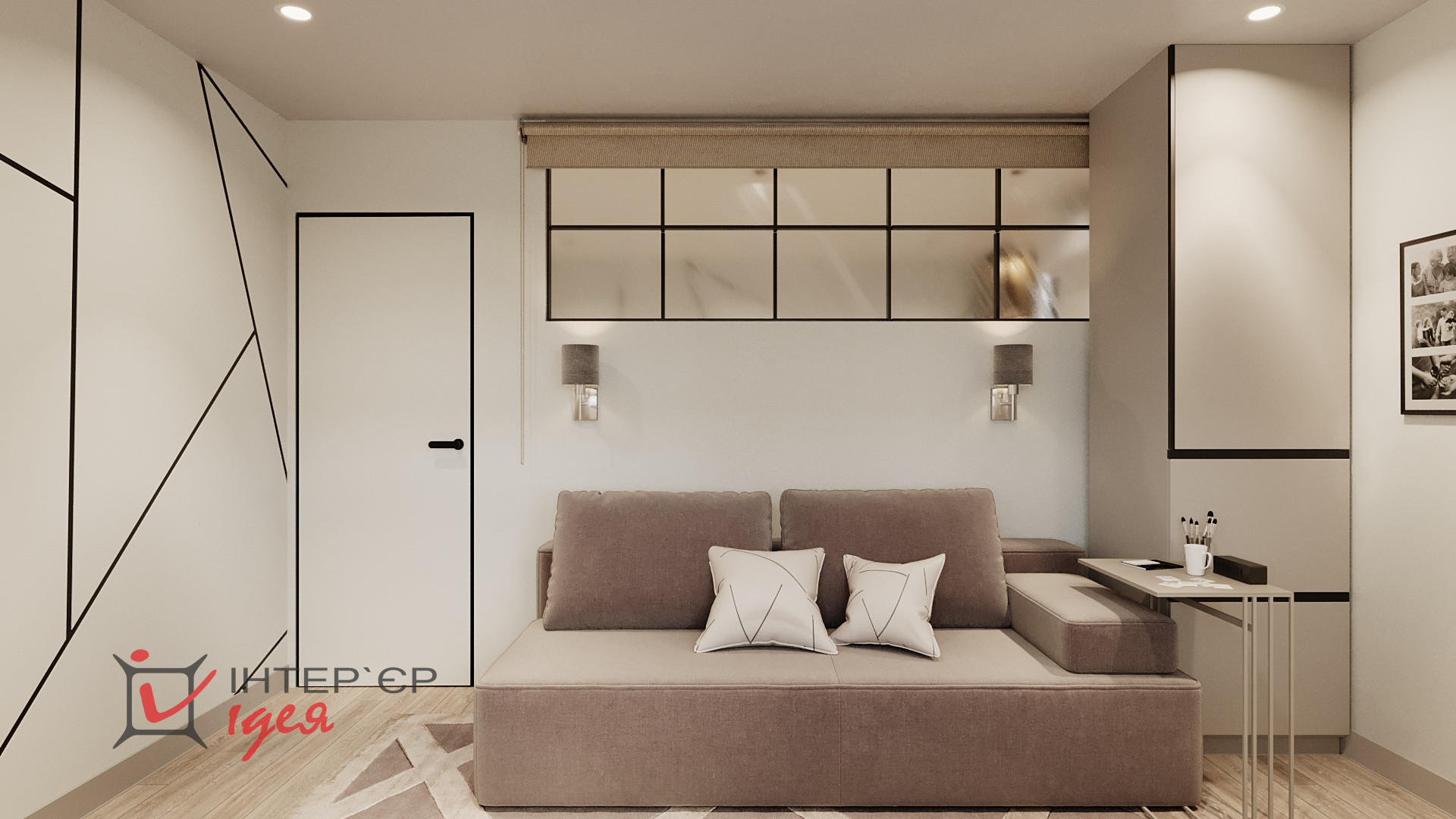 Інтер’єр оформлений у стилі сучасного мінімалізму з нотками скандинавської простоти й легким відтінком індустріального стилю, який підкреслює скляна перегородка з чорною металевою рамою.