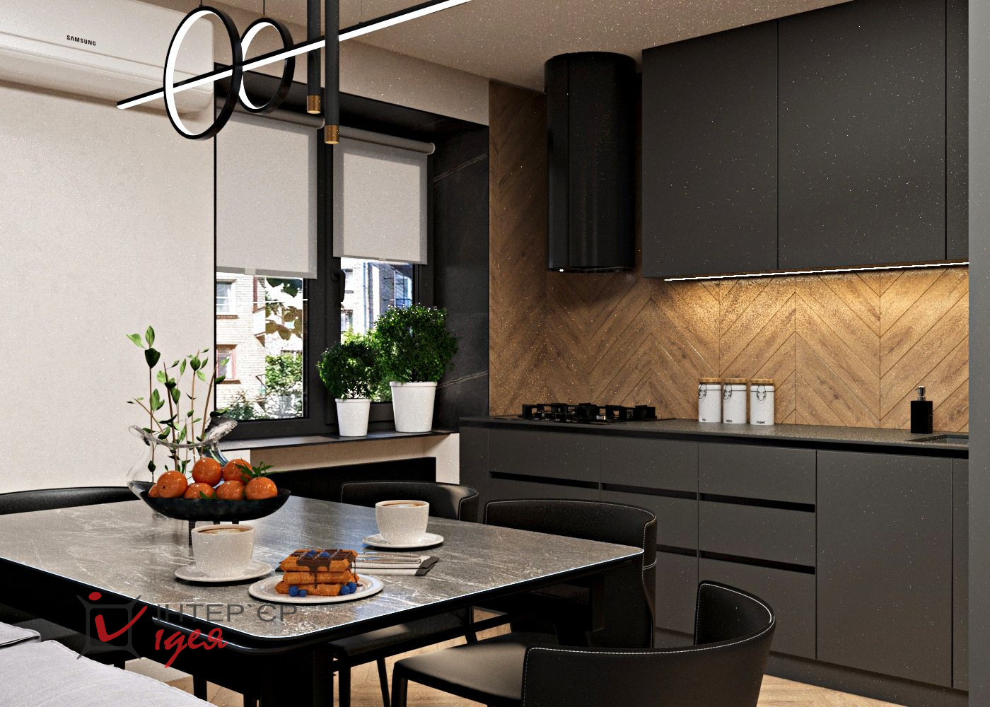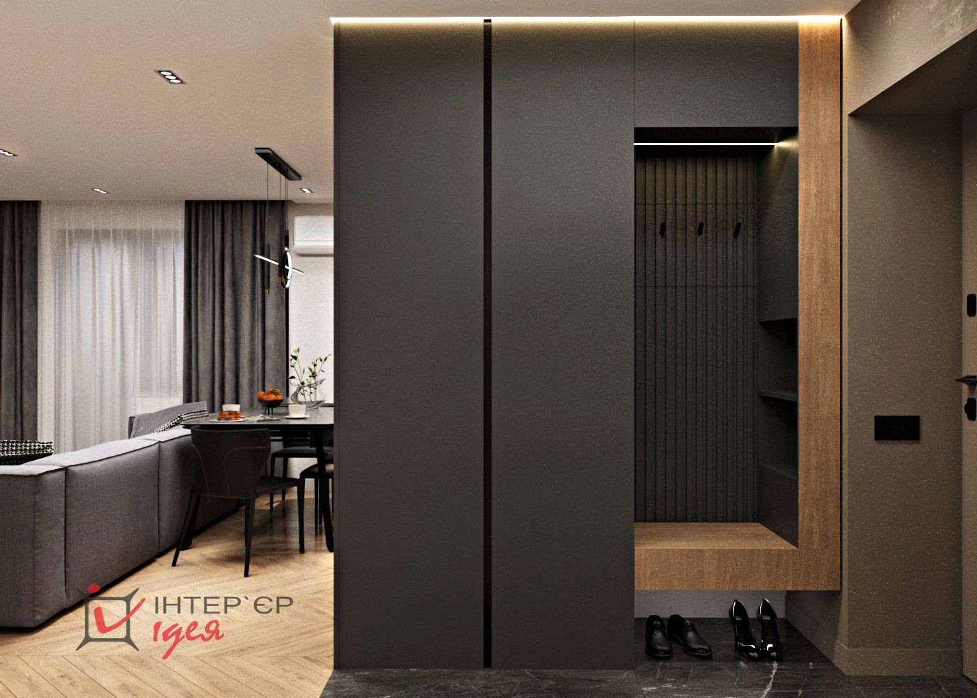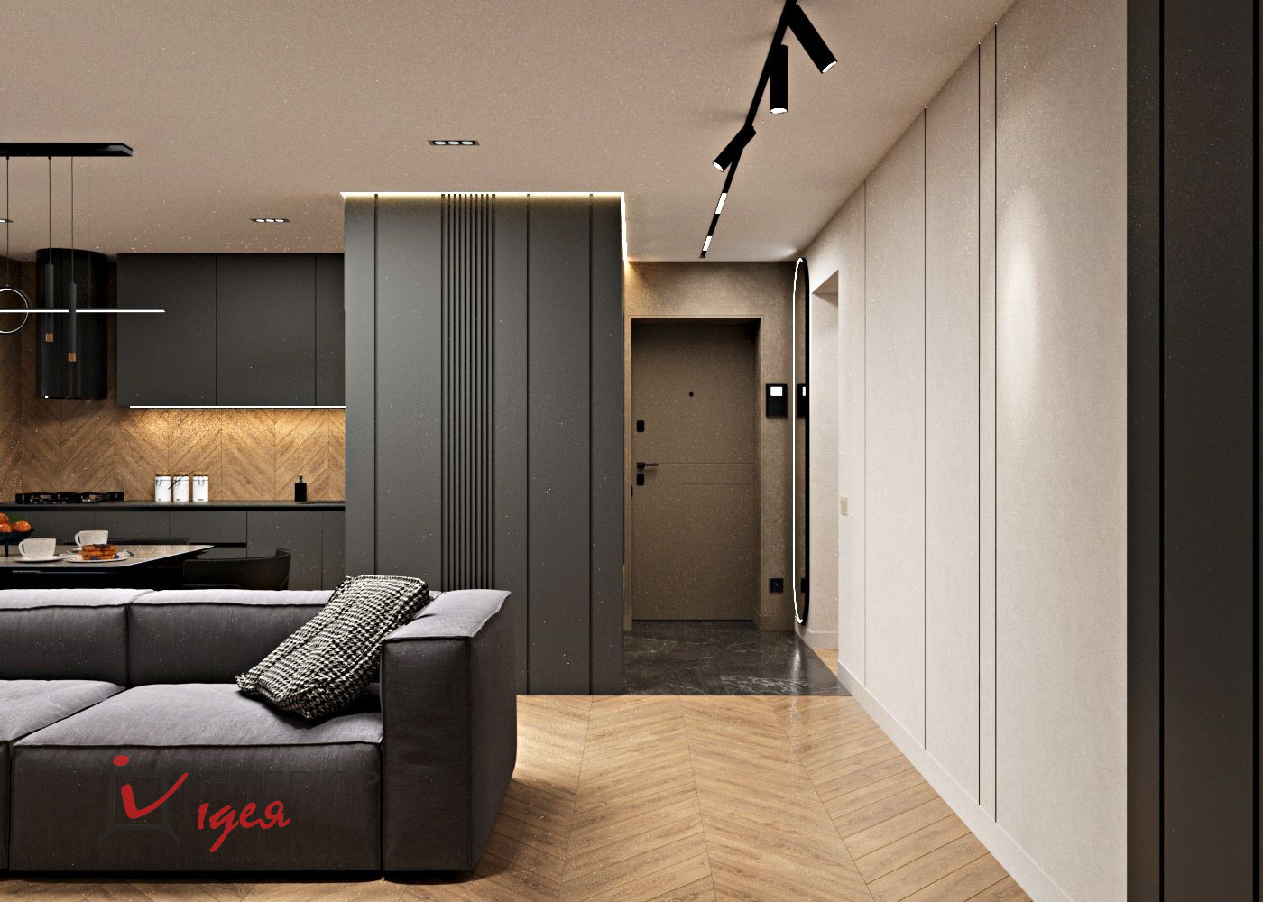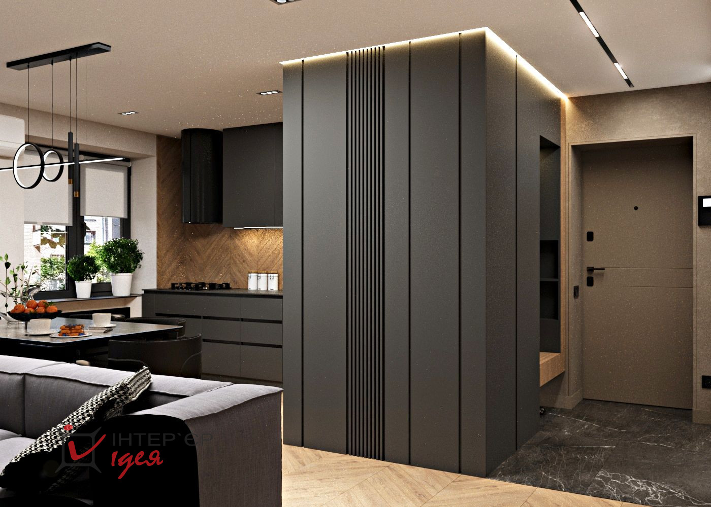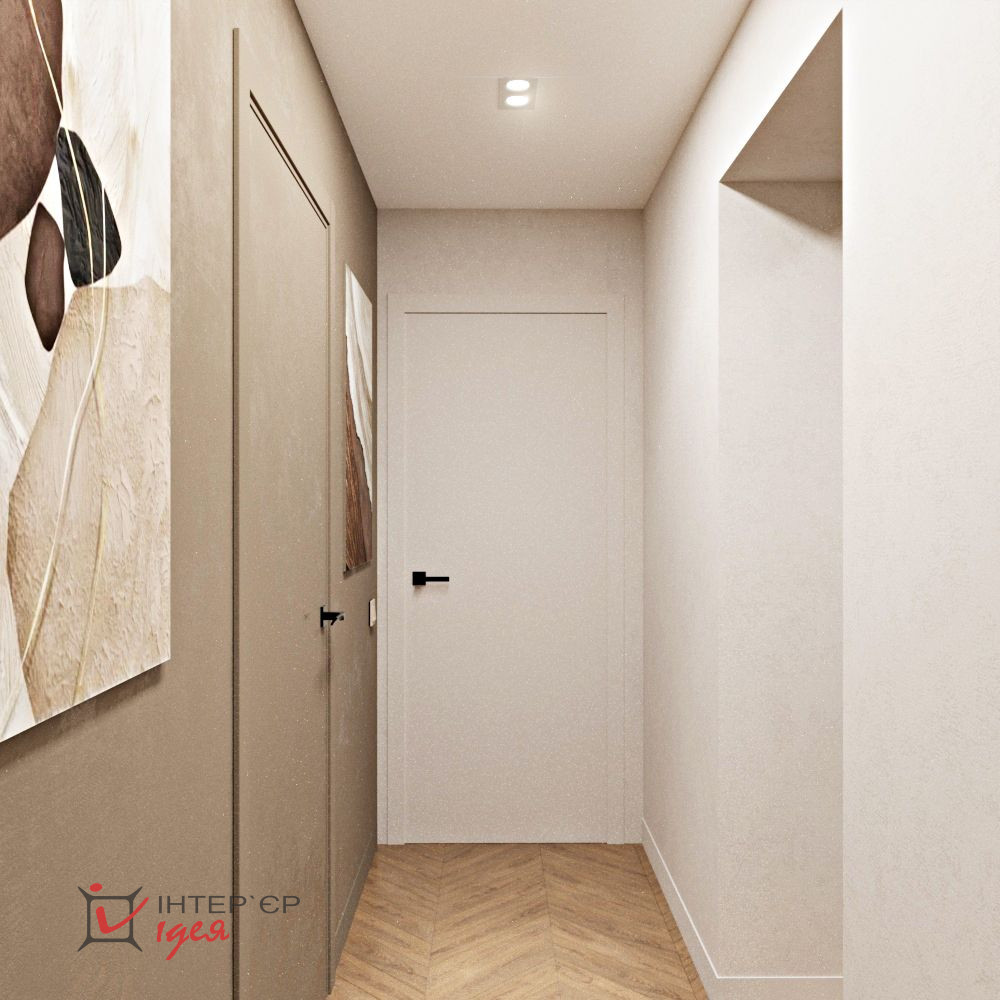 Весь контраст інтер’єру балансує тепла текстура дерева - на підлозі, на кухонному фартуці, а також насичений бежевий колір фарби на стінах - в передпокої, в коридорі та на лоджії.