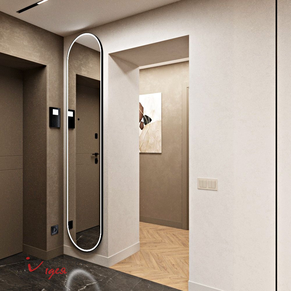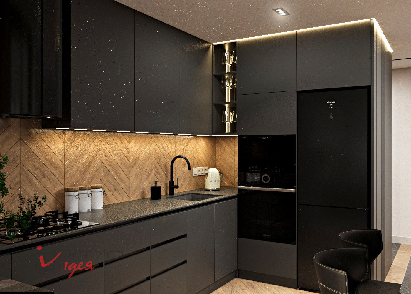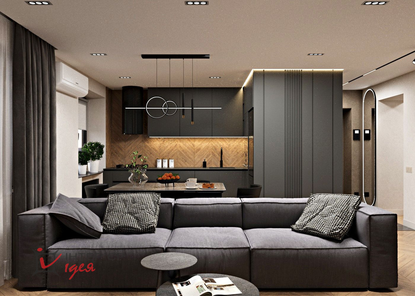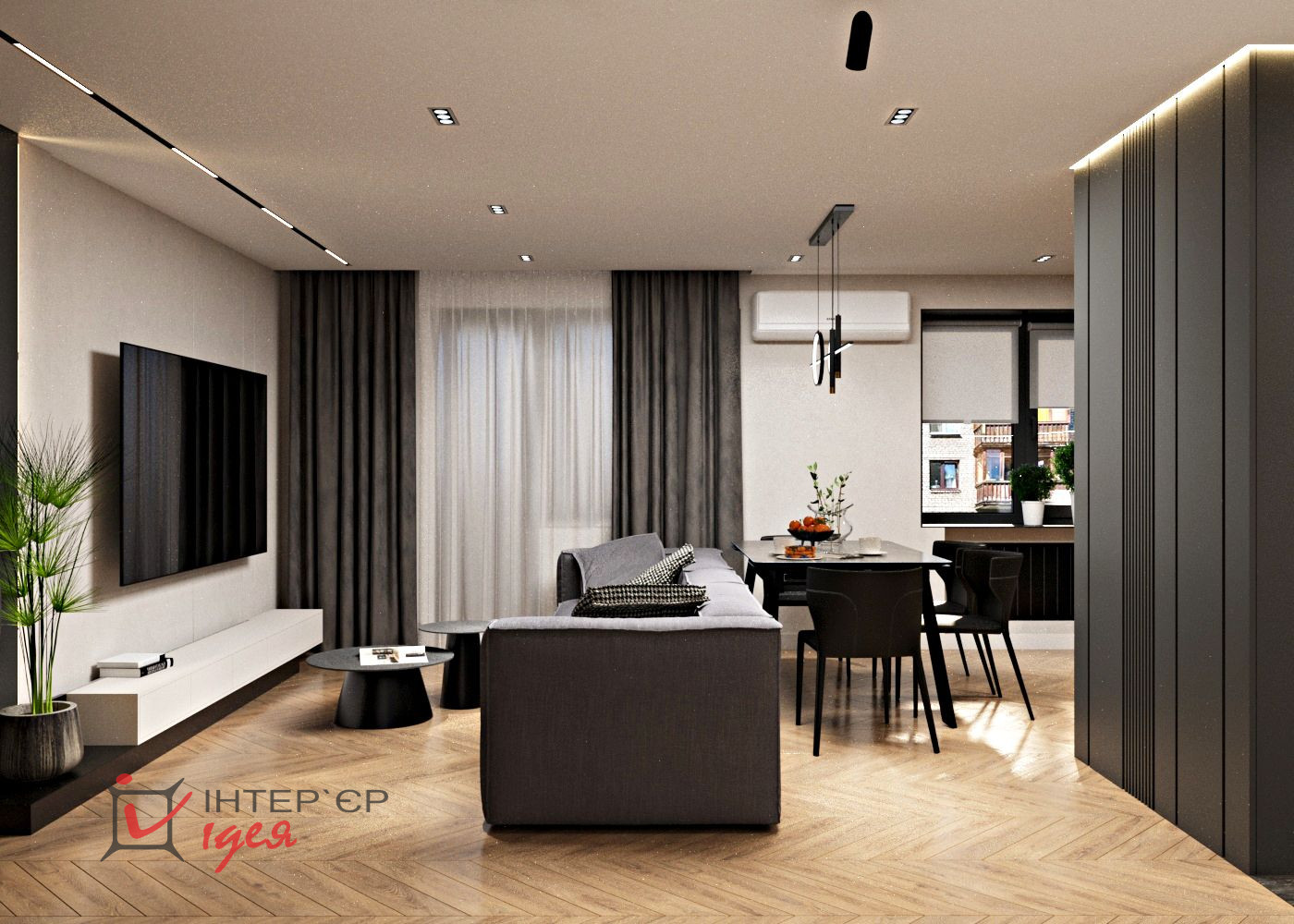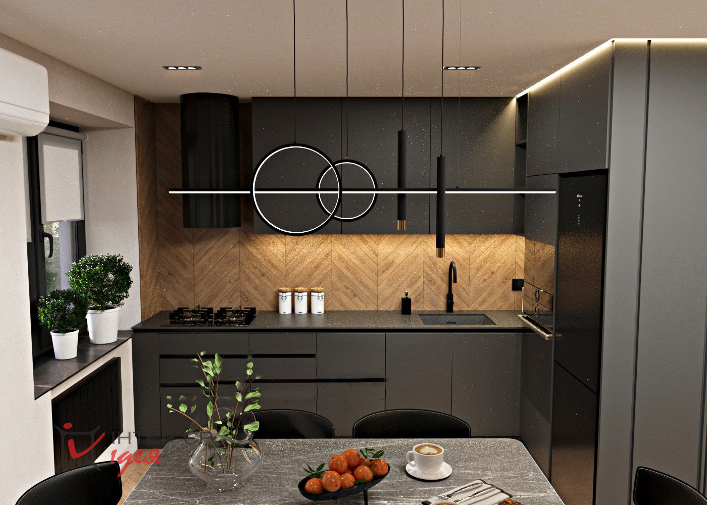 Весь контраст інтер’єру балансує тепла текстура дерева - на підлозі, на кухонному фартуці, а також насичений бежевий колір фарби на стінах - в передпокої, в коридорі та на лоджії.