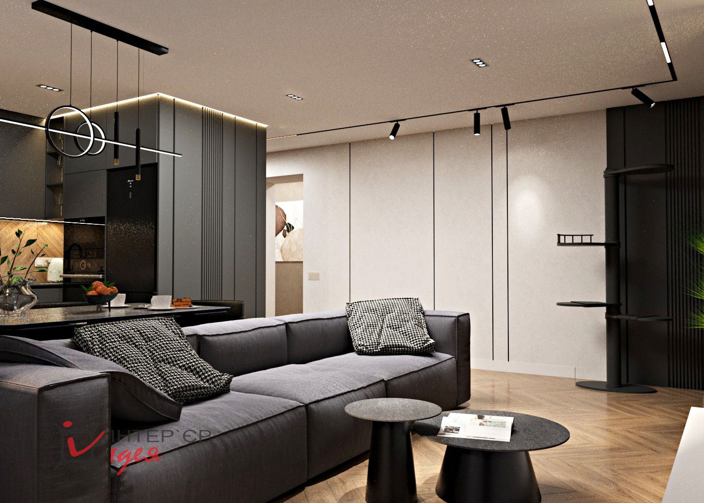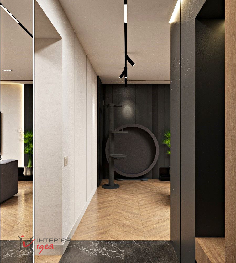 Також одним з завдань було розмістити в кімнаті відкритий ігровий комплекс та бігове колесо для пухнастих домашніх улюбленців. Тому було вирішено розмістити комплекс на фоні темної рейкової панелі, що візуально маскує та приховує ці об'єкти.