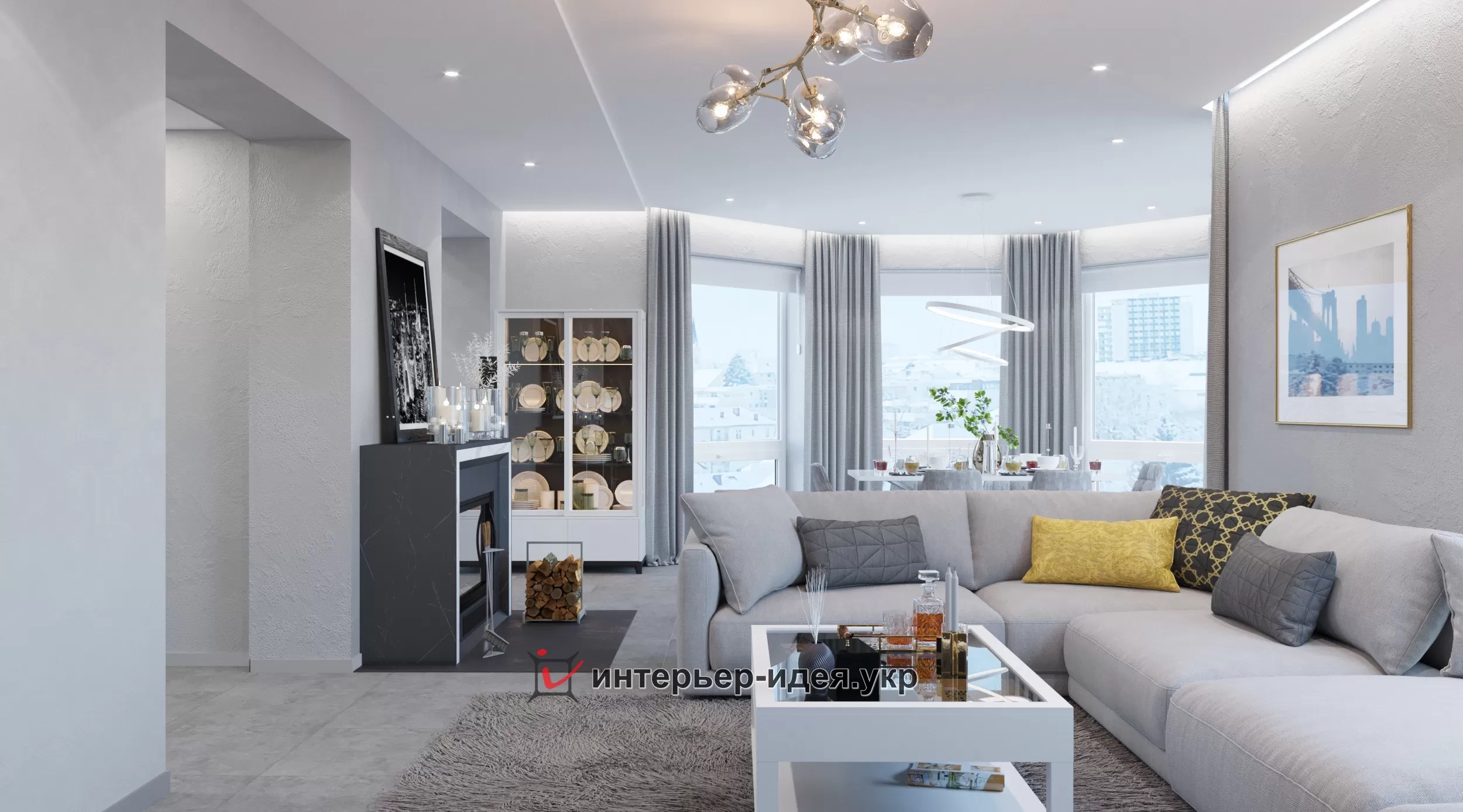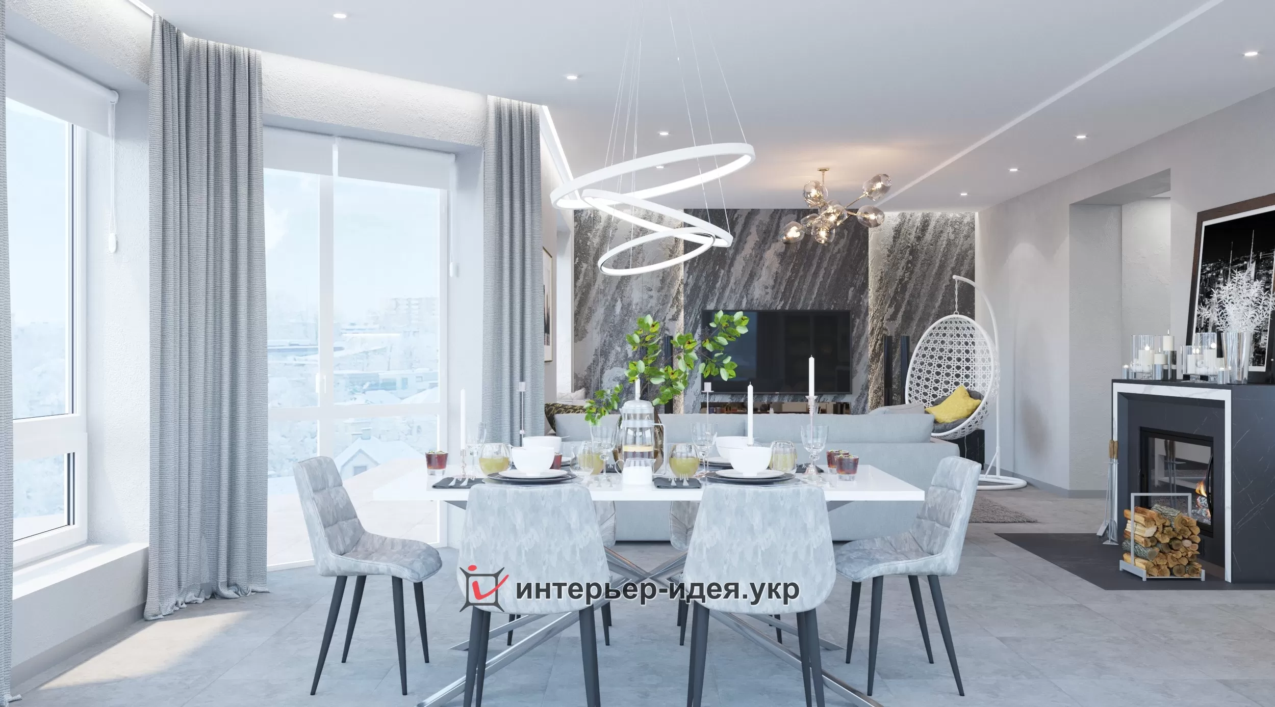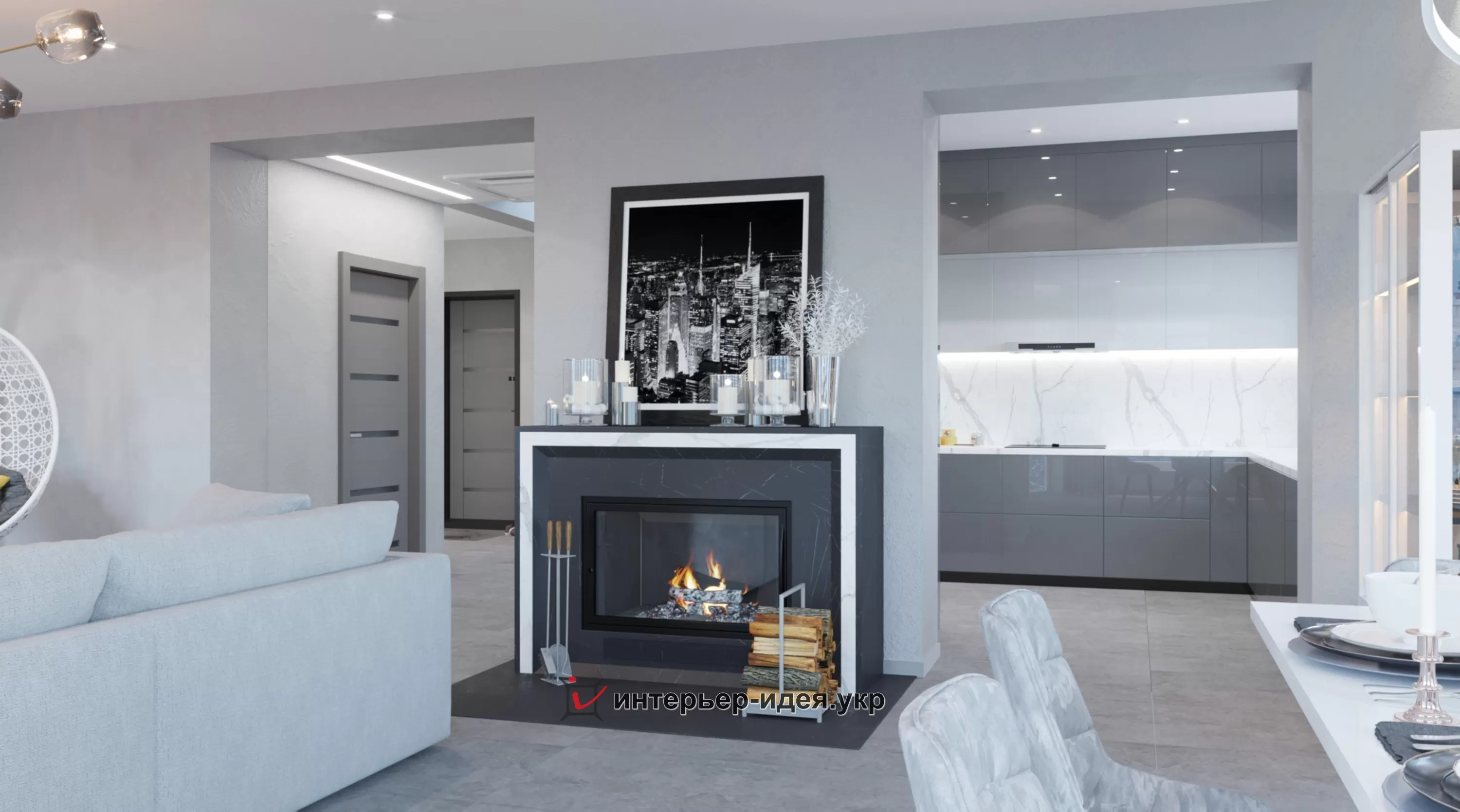 Вітальню ми розділили за допомогою натурального каміна, обкладеного чорним мармуром, на зону відпочинку і прийому їжі.