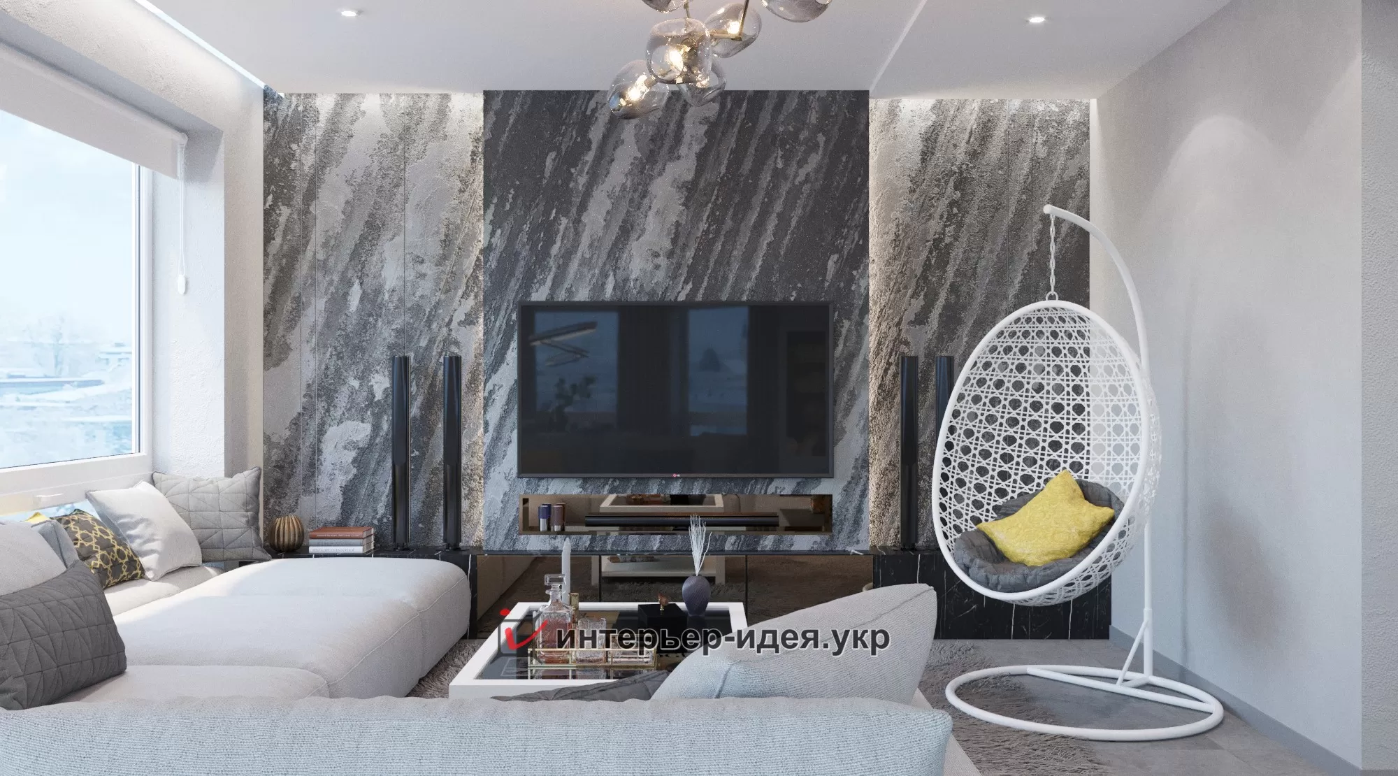 Вся стіна за телевізором виконана рельєфною штукатуркою.