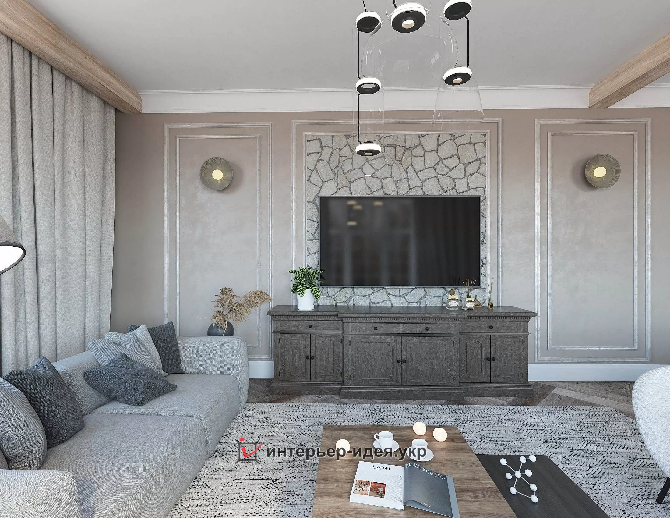 На стінах використані молдинги зі вставками природного каміння, які гармонують з каміном. Загалом смакові уподобання та дух приміщення були виконані відповідно до побажань замовників.