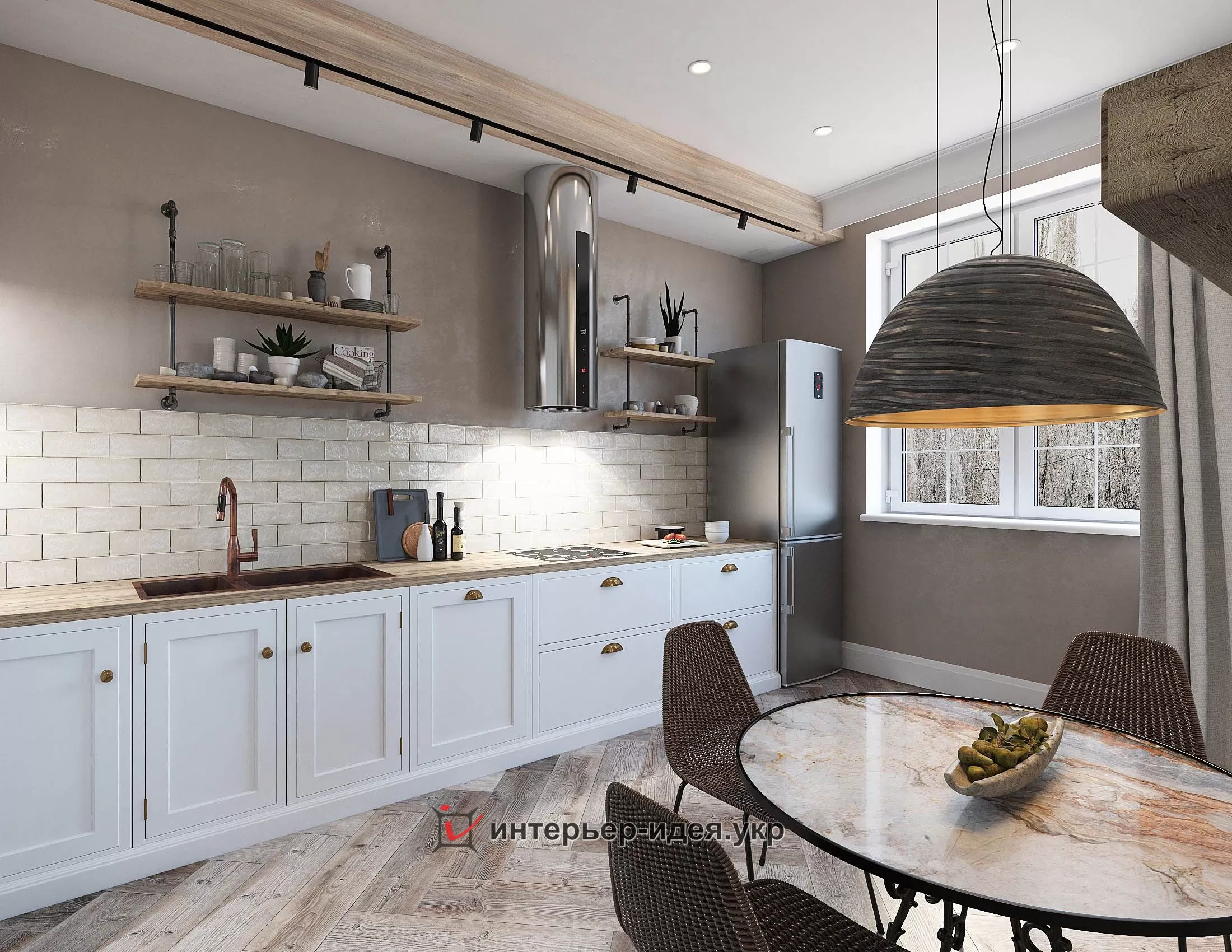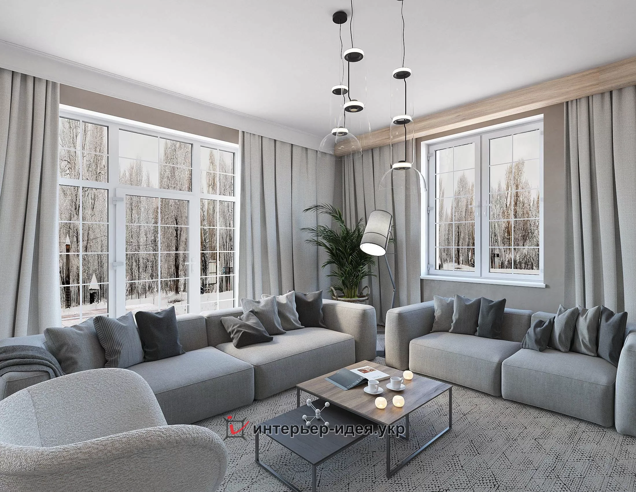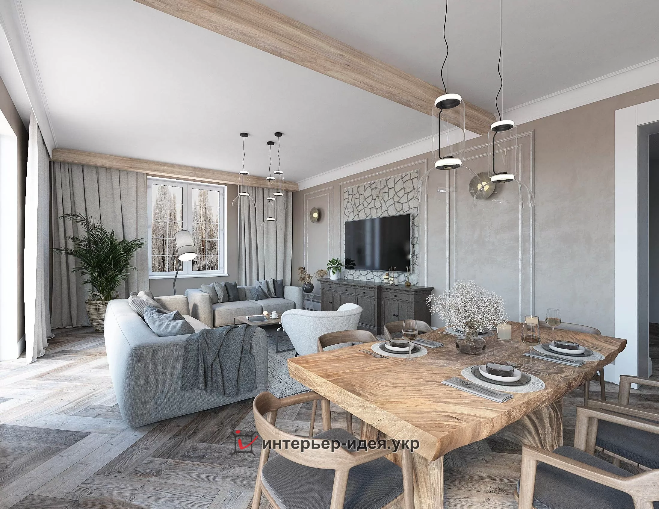 У зв'язку з тим, що приміщення досить велике за розмірами, було вирішено зробити дерев'яні балки на стелі, які в свою чергу розбили візуально приміщення на зони.