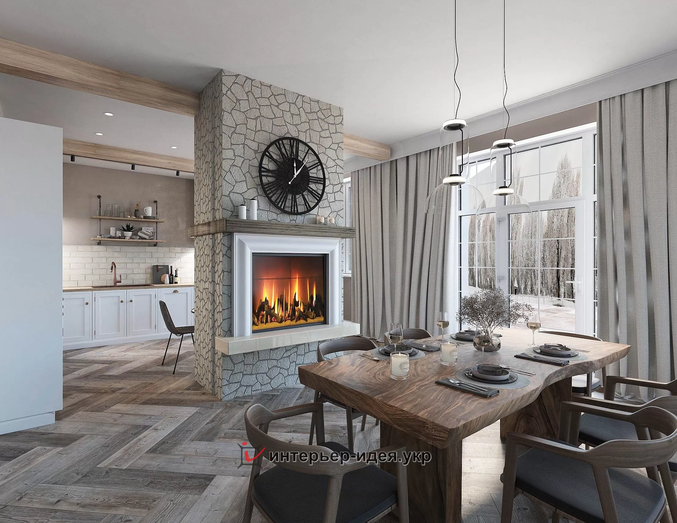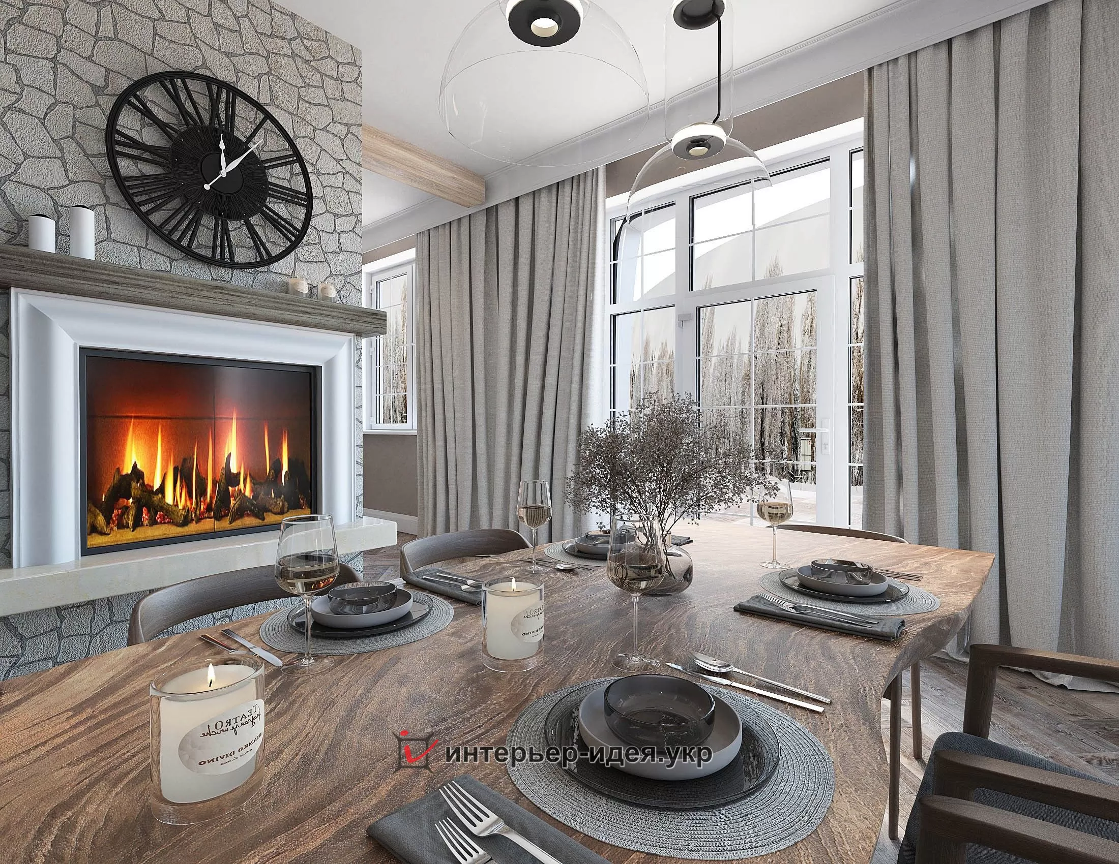 Обідня зона представлена столом у сільському стилі, що переносить в атмосферу села.