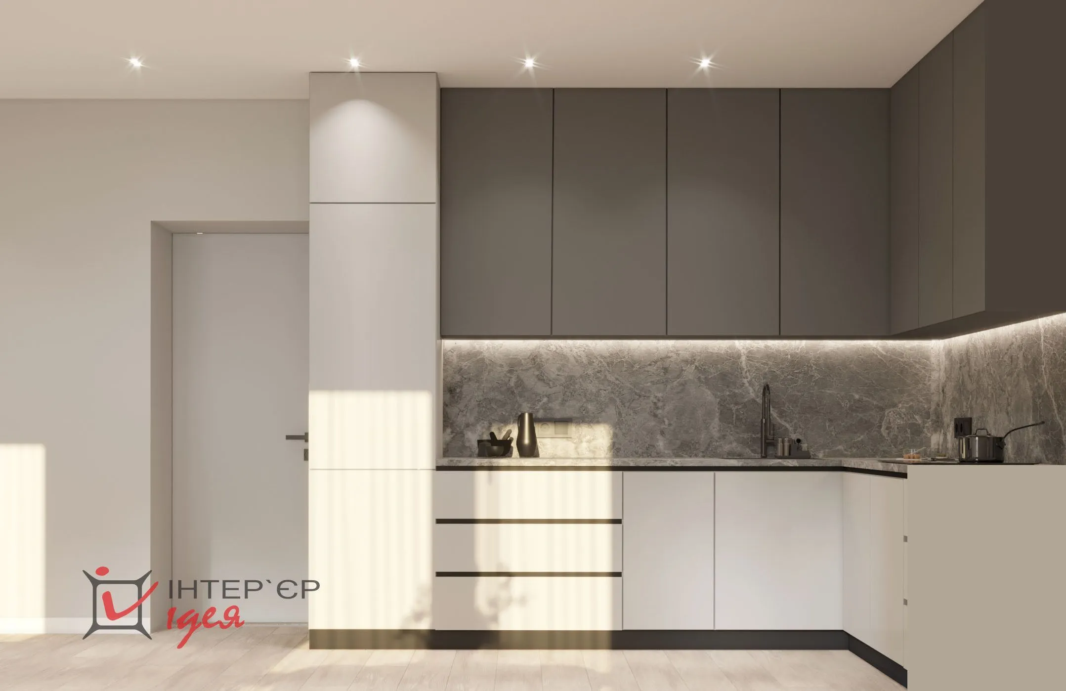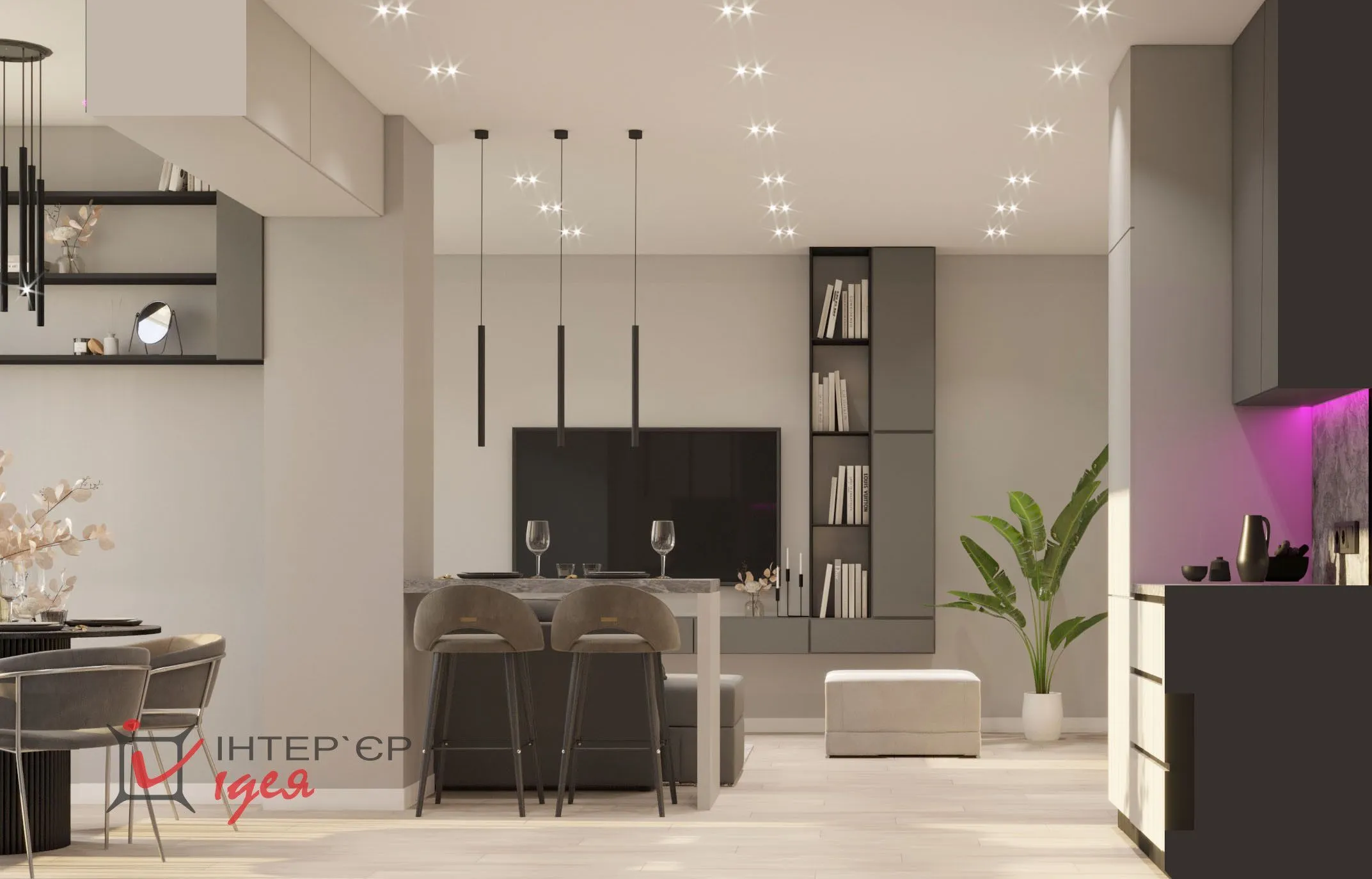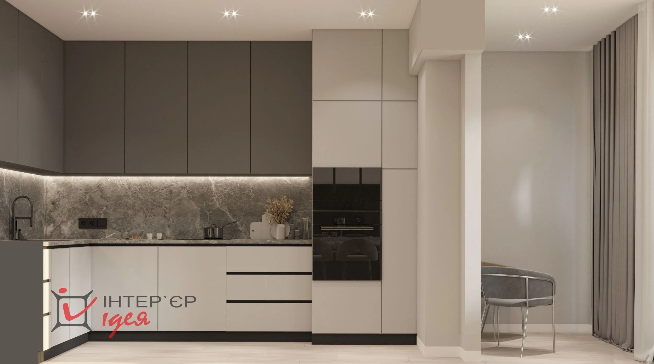 Квартира виконана в стриманій кольоровій гамі, переважають сірі відтінки з чорними акцентами - в якості деталей інтер’єру, а саме світильники, полиці, пази в шафах, вимикачі, чорний металевий профіль на стінах у спальні та кабінеті.