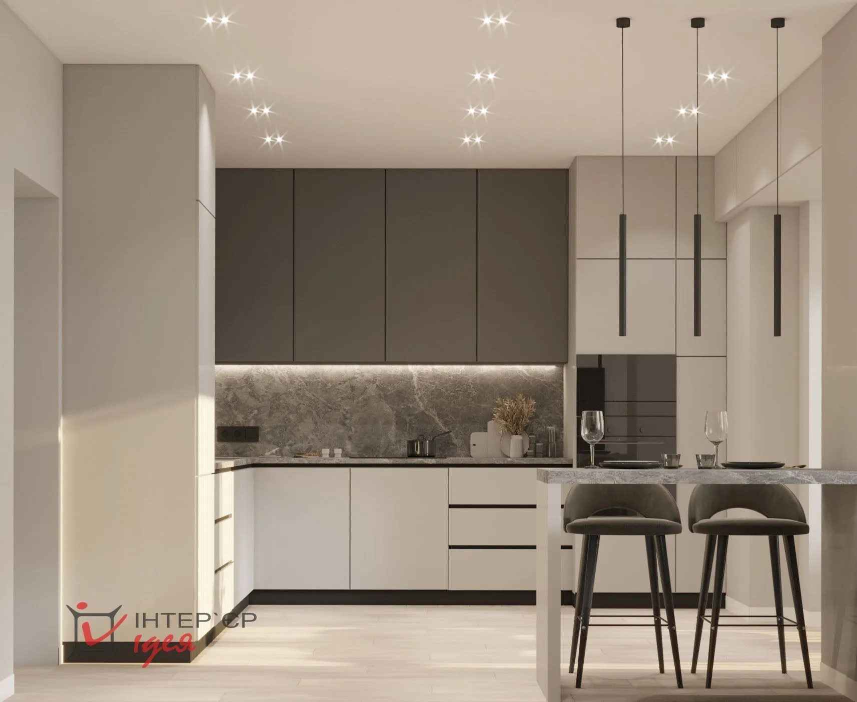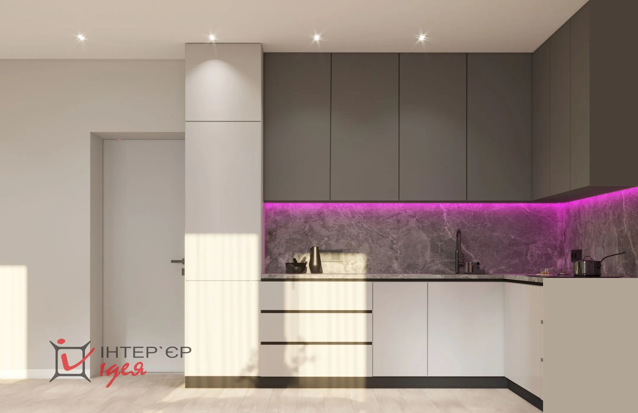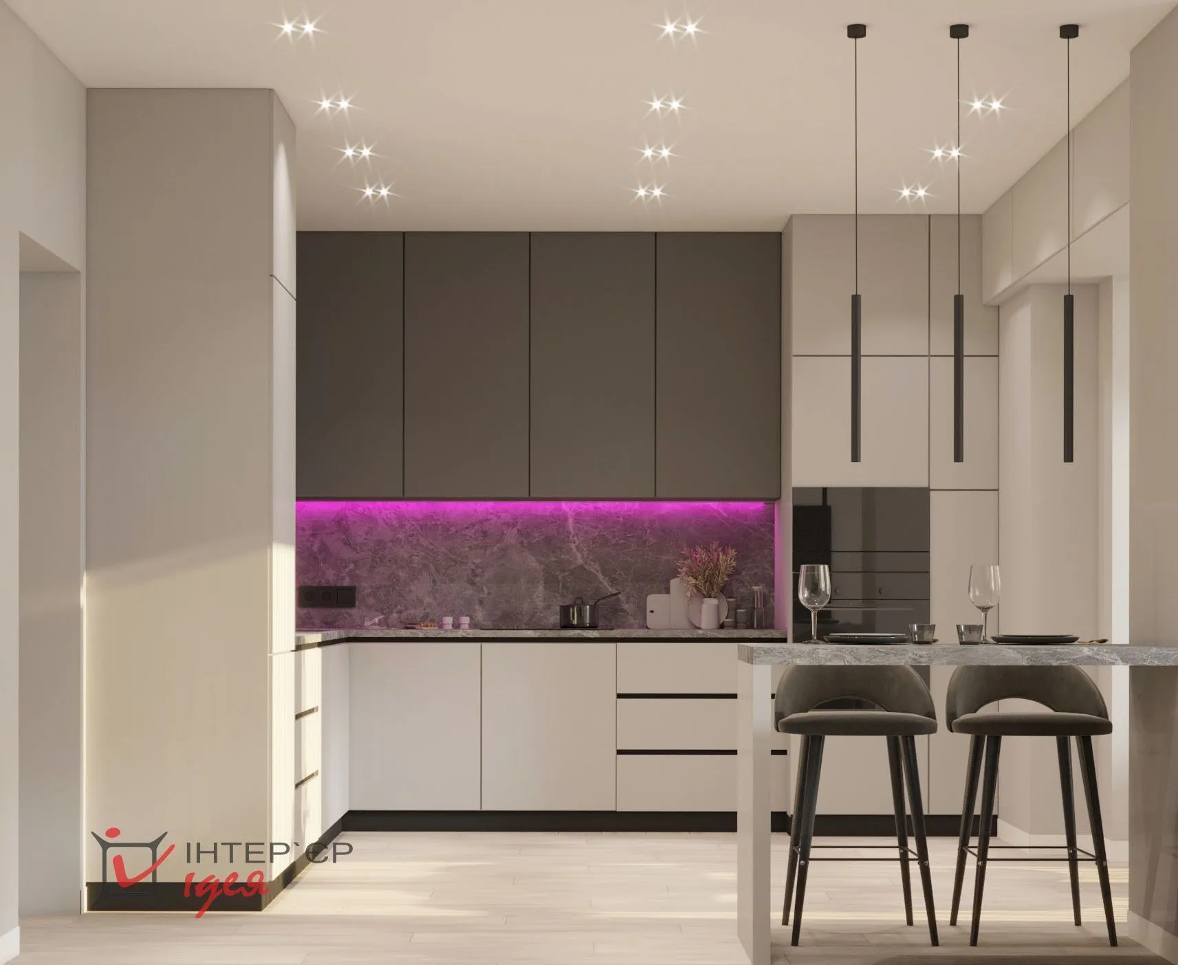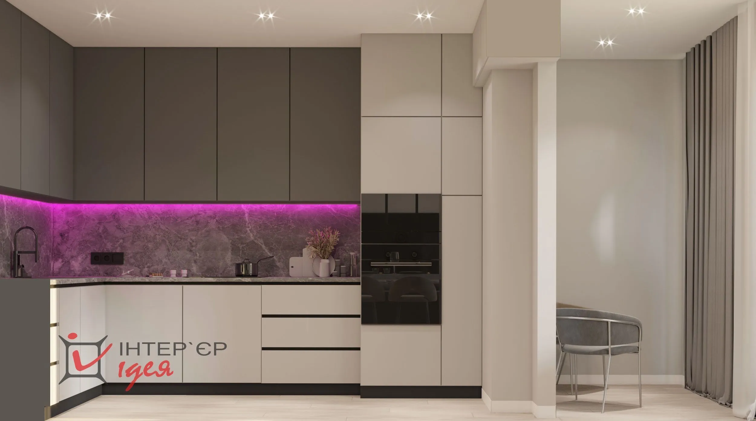 Квартира виконана в стриманій кольоровій гамі, переважають сірі відтінки з чорними акцентами - в якості деталей інтер’єру, а саме світильники, полиці, пази в шафах, вимикачі, чорний металевий профіль на стінах у спальні та кабінеті.