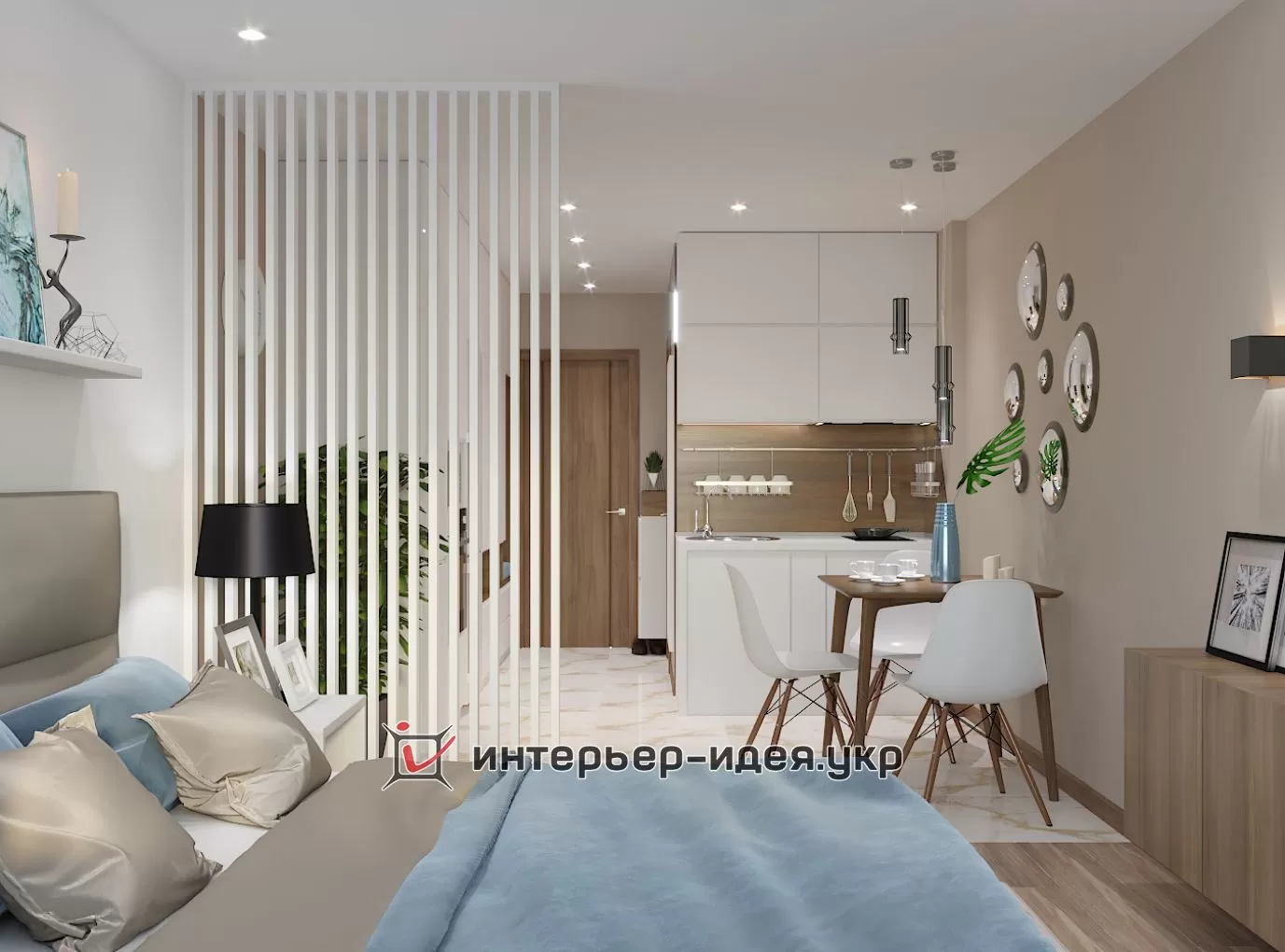 Відокремили зону спальні перегородкою яка зіграла свою декоративну роль в інтер'єрі.