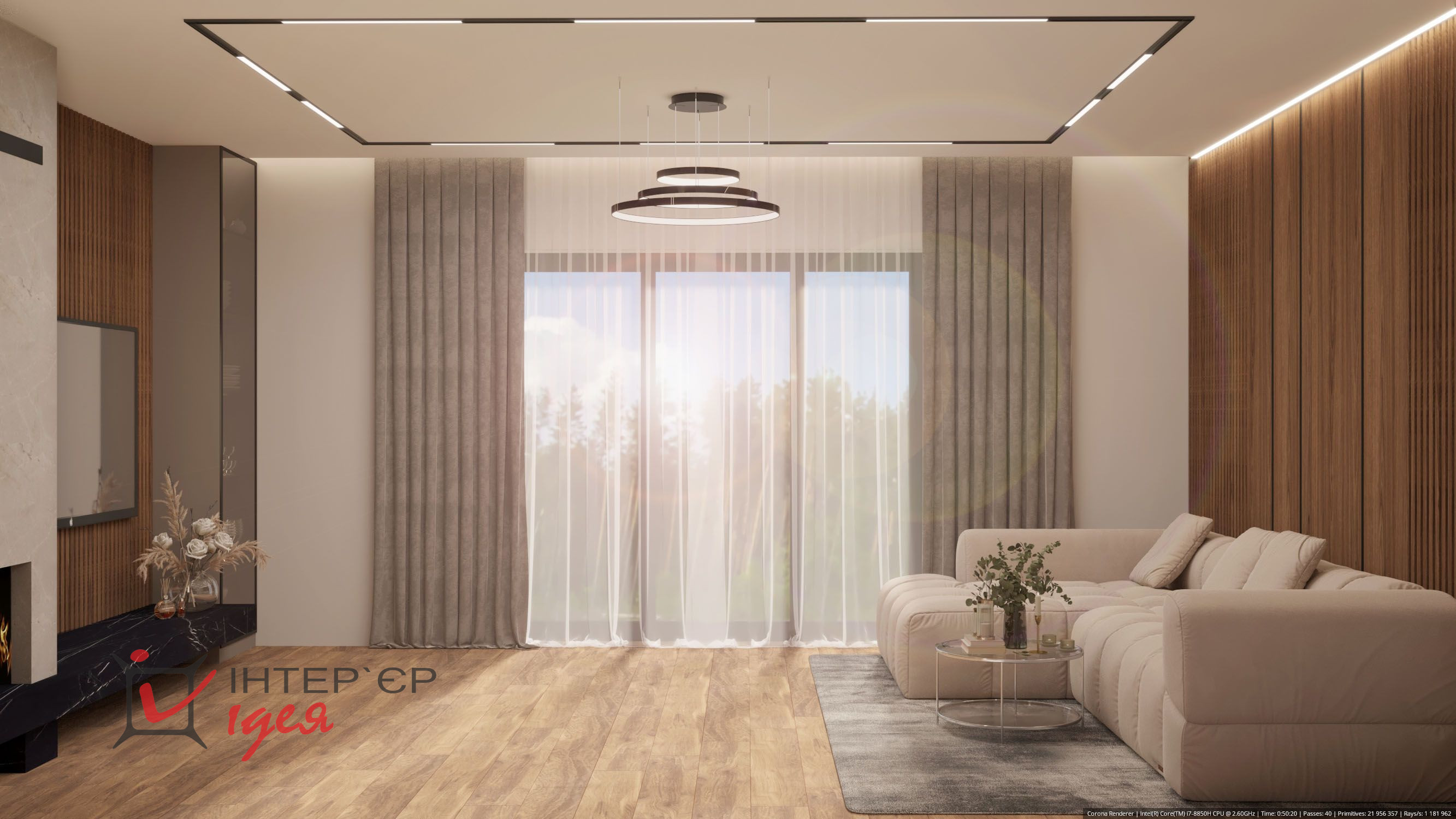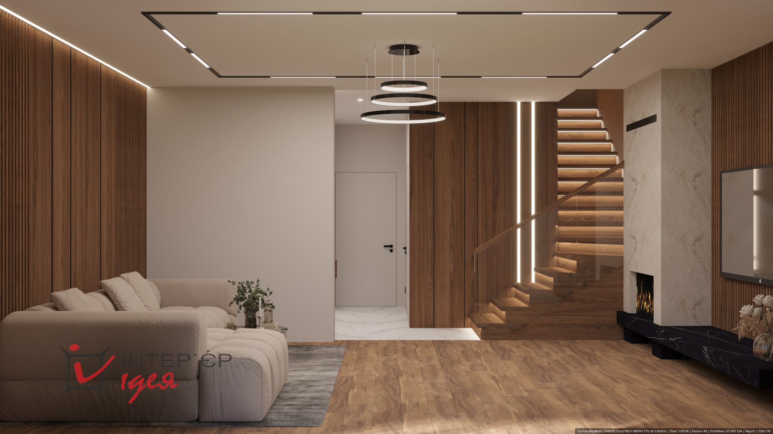 У цьому інтер'єрі поєднано стриману елегантність та функціональність. Монохромні стіни та приховані двері формують чисту, вивірену геометрію простору, в якій кожна деталь ретельно продумана. Чорна фурнітура додає контрасту й характеру, а теплі дерев’яні панелі з гравіюванням та підсвітками створюють відчуття затишку та глибини.