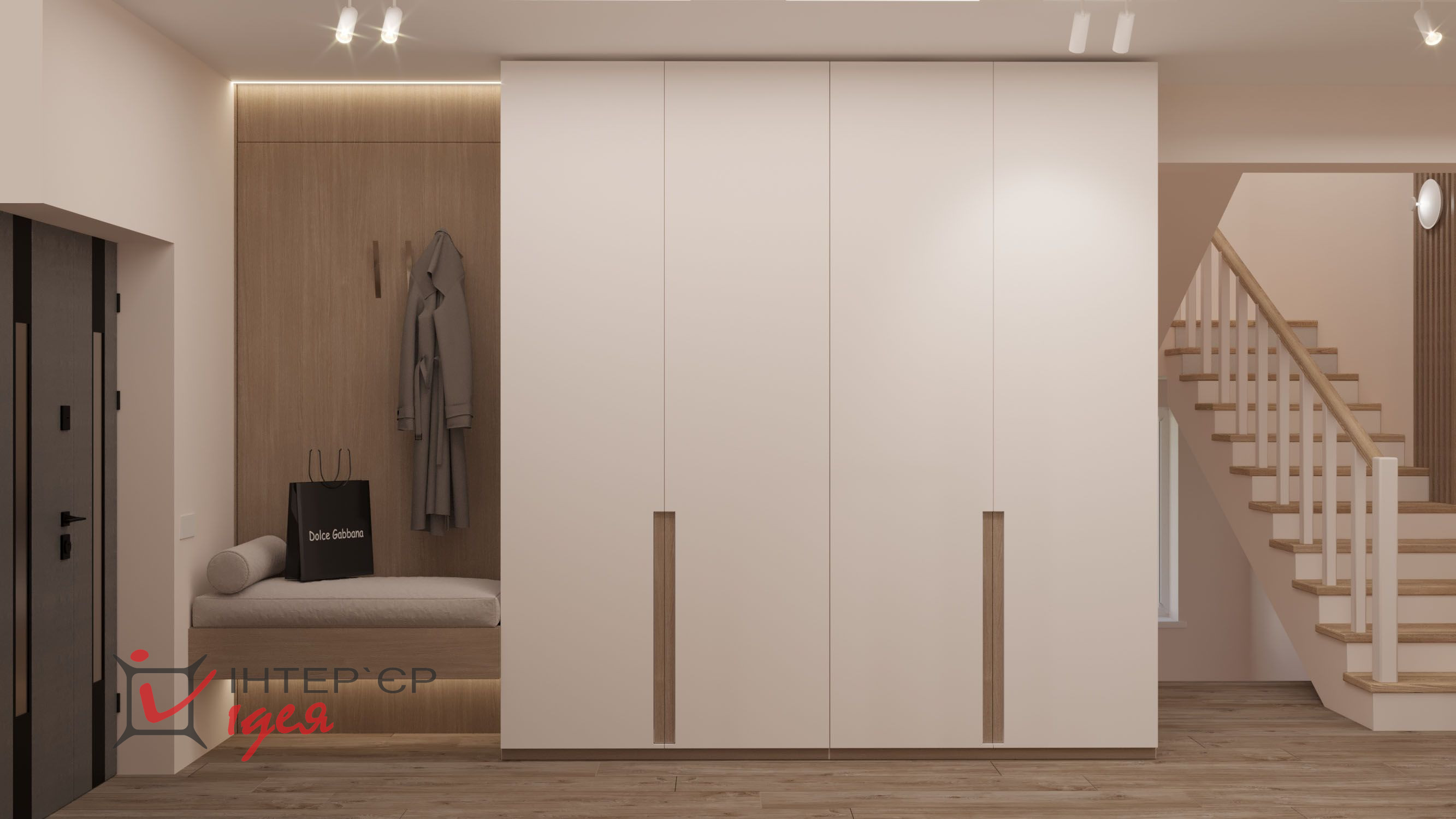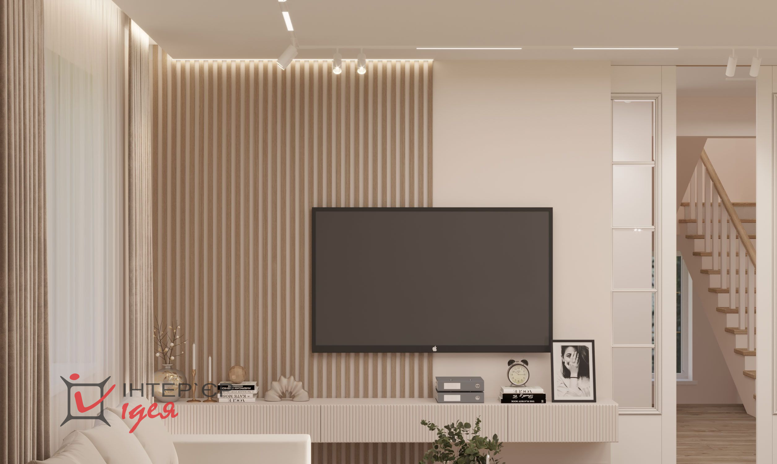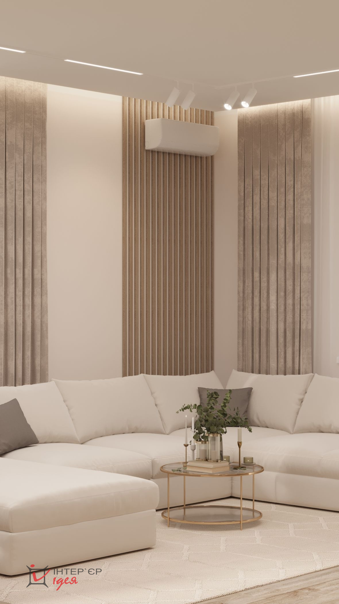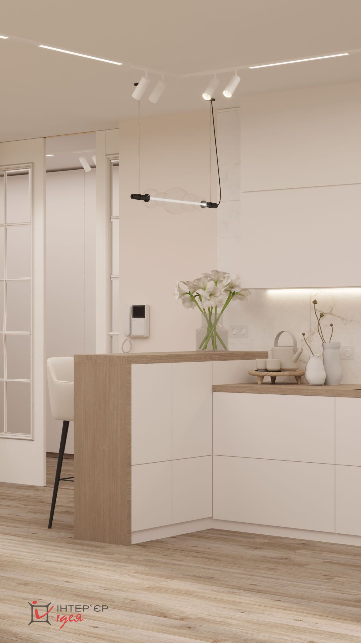Цей інтер'єр виконаний у стилі сучасного мінімалізму з елементами скандинавського дизайну. Простір об'єднує кухню та вітальню, створюючи світлу затишну та простору атмосферу.