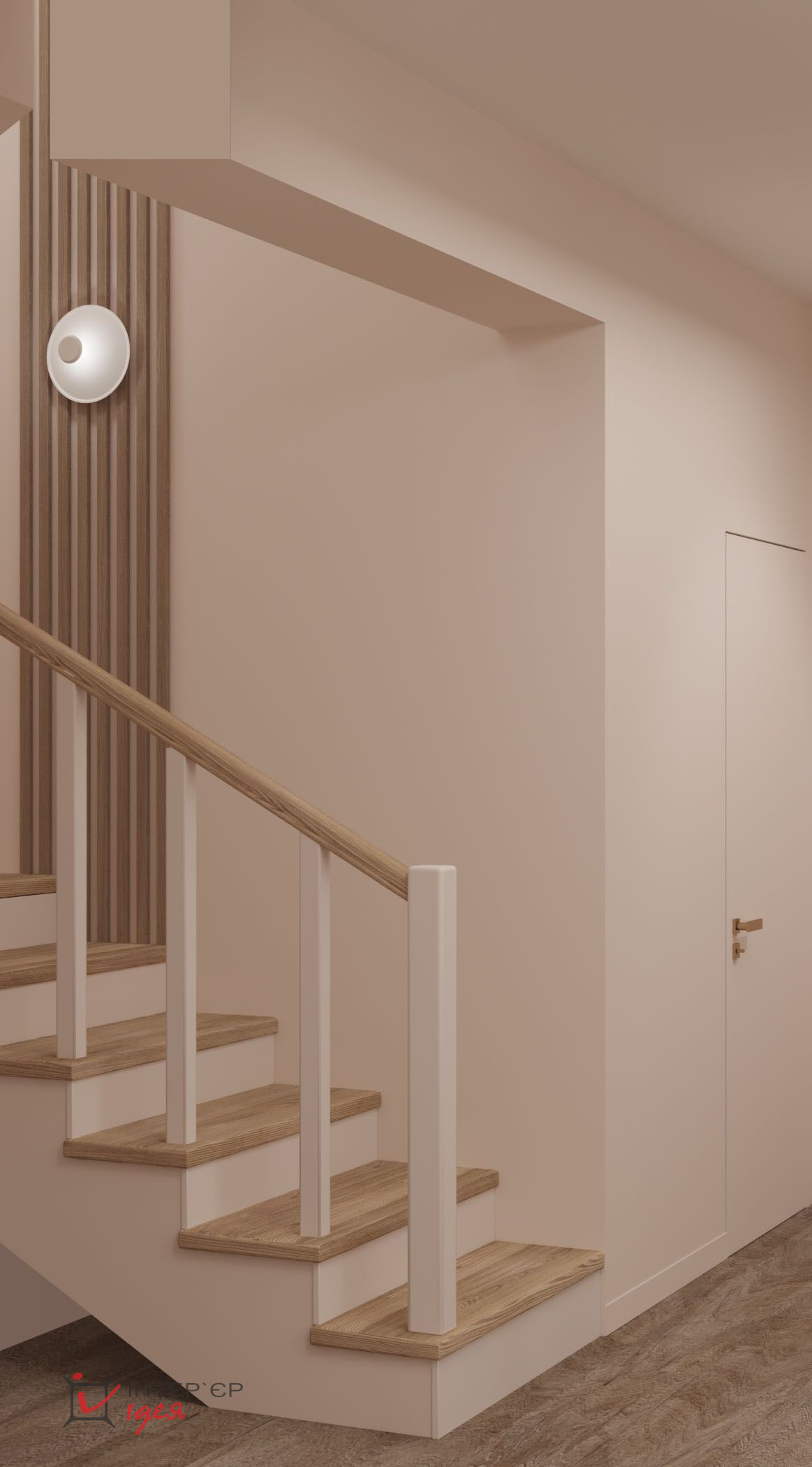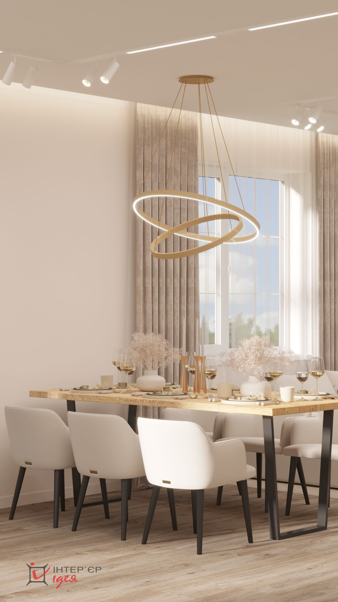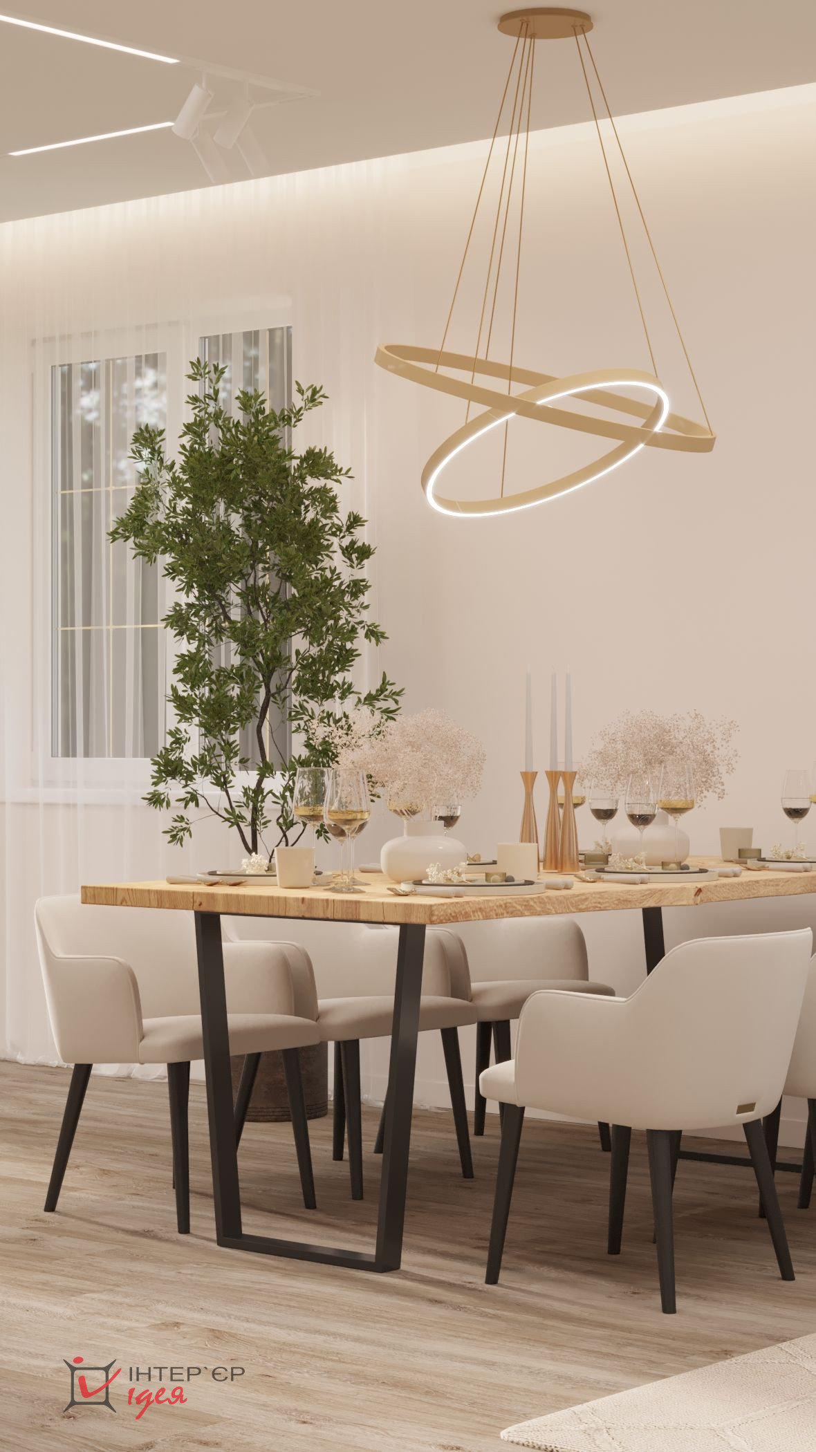 Світлі кремові та дерев'яні відтінки гармонійно поєднуються з текстурою мармуру на стіні кухонної зони. Барні стільці та стільці для обіднього столу мають м'яку оббивку, що додає комфорту. Елегантні люстри геометричної форми з м'яким підсвічуванням надають інтер'єру витонченості. Природні матеріали, дерев'яна підлога та декор у вигляді живих рослин створюють відчуття тепла та природності.