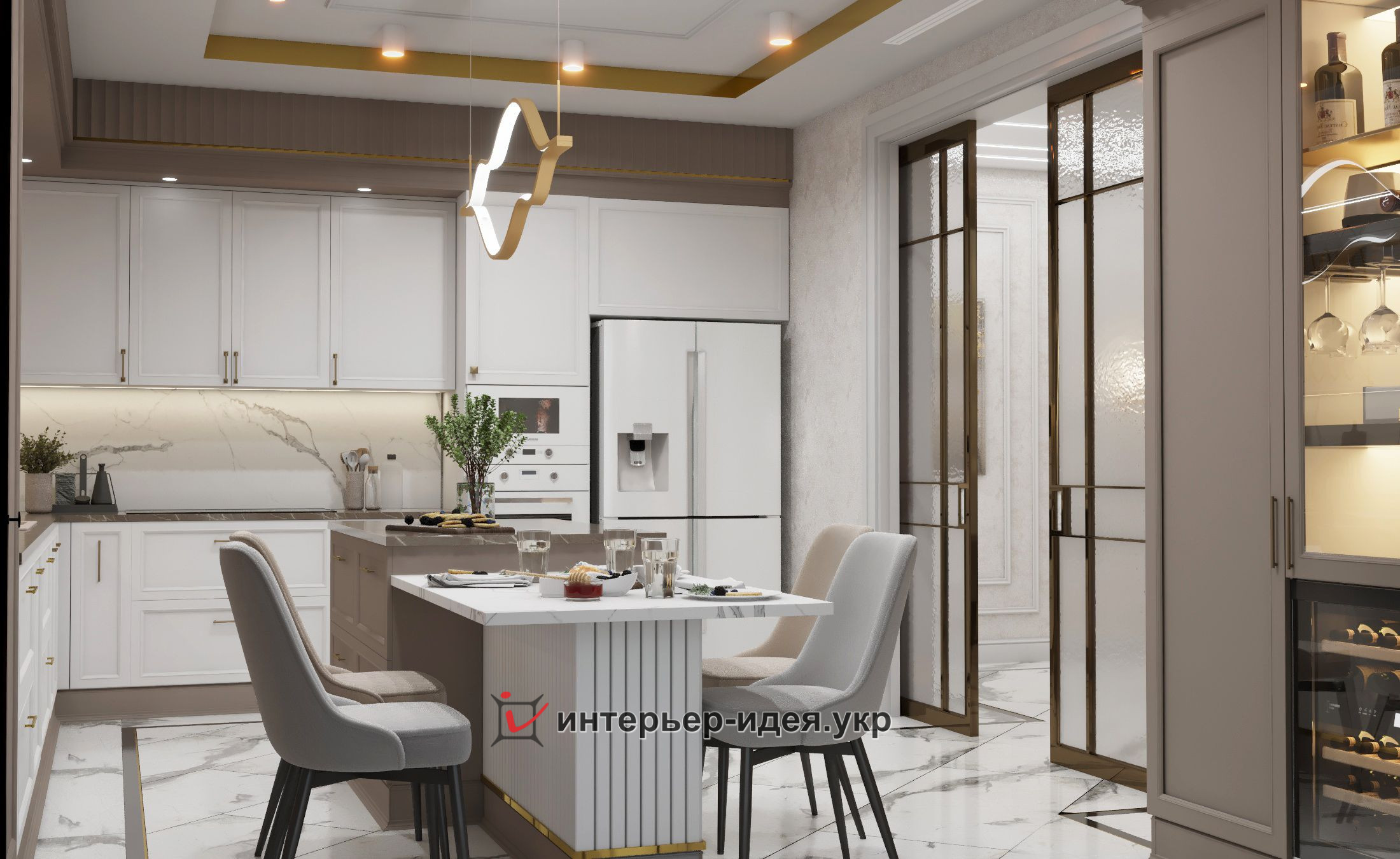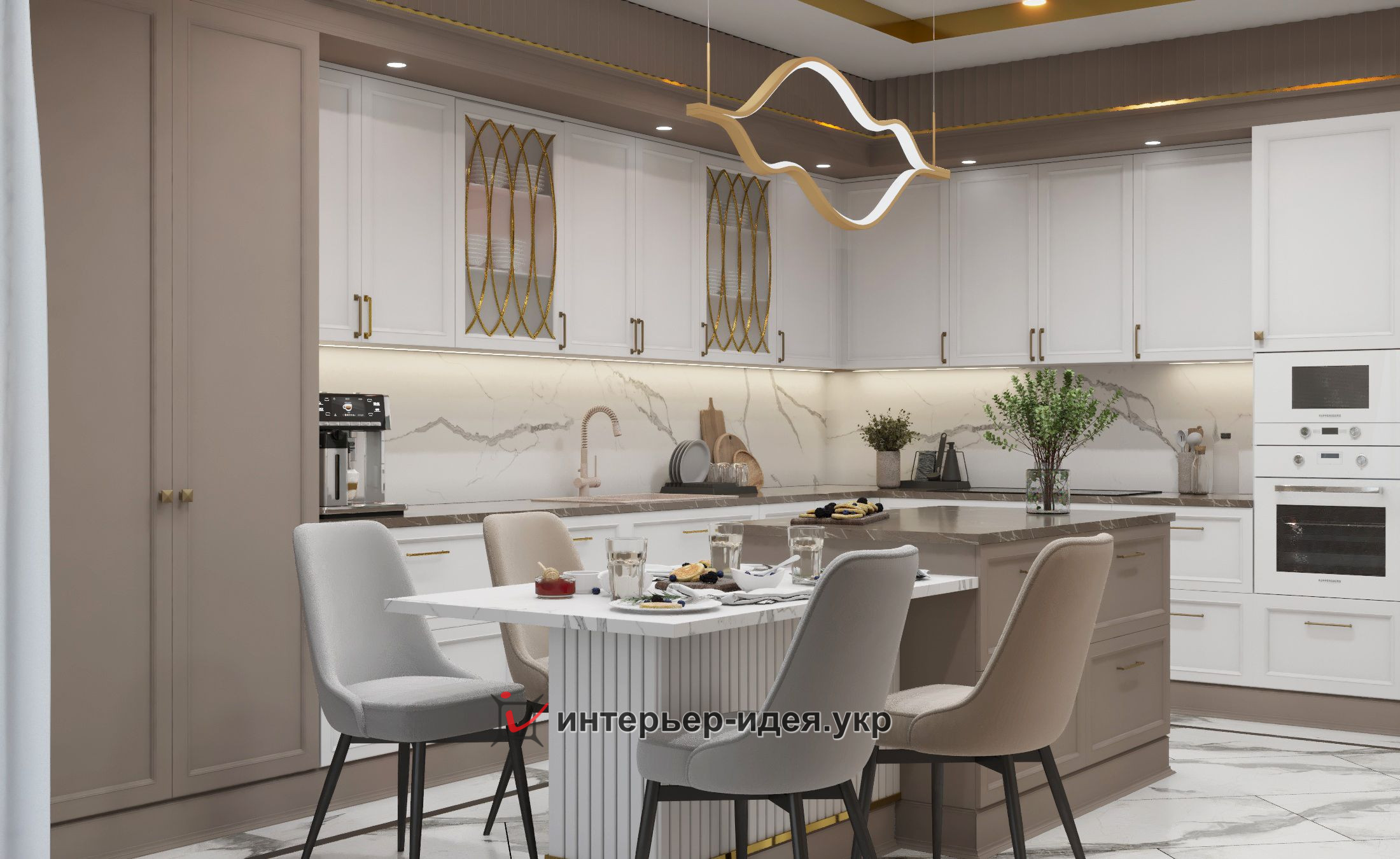 Для підсвічування обіднього столу і робочої поверхні острова використали стильний підвісний світильник зі золотистими елементами, що додають шарму.