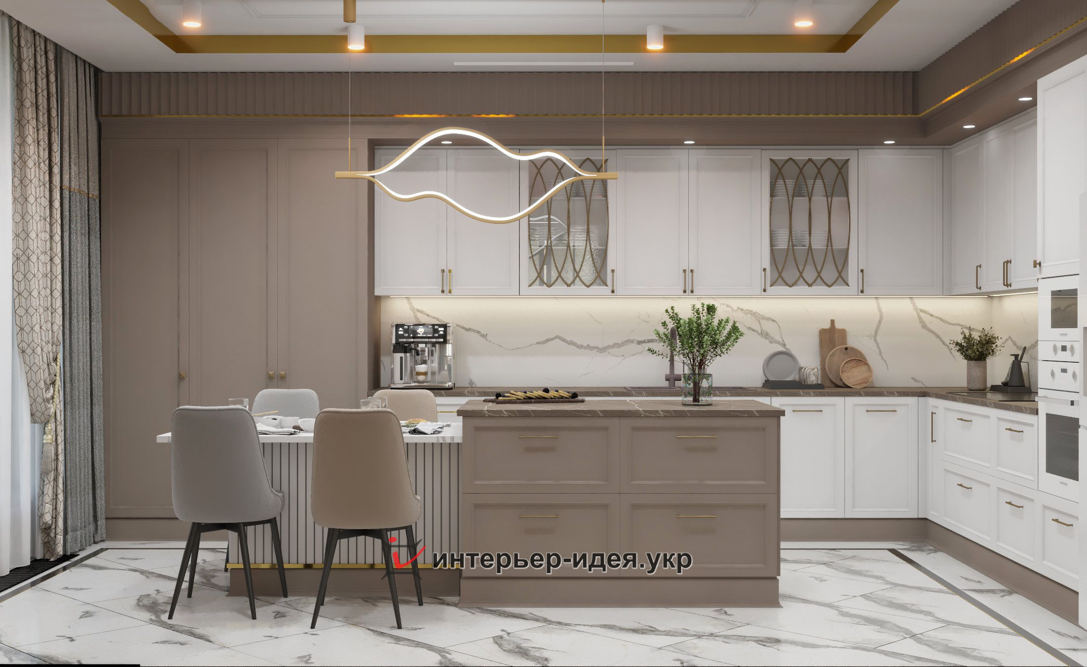 Кухонний гарнітур виконаний в білих тонах з коричневими акцентами, що підкреслює класичний стиль. Він включає в себе шафи для зберігання посуду, техніки та інших кухонних речей.