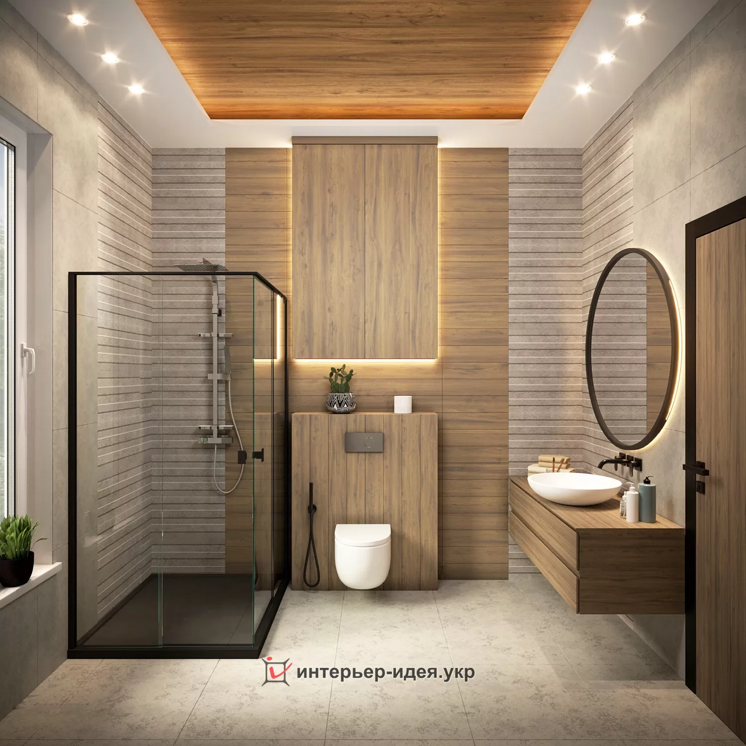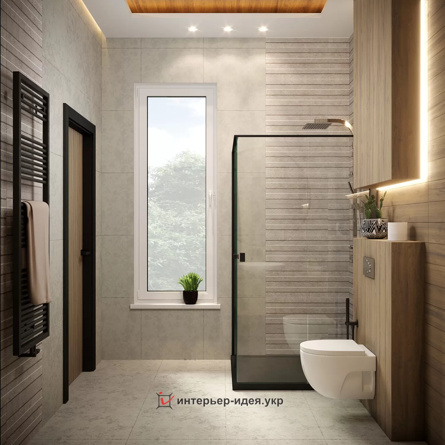 Санвузол оздоблений керамо-гранітною плиткою під бетон та дерево.