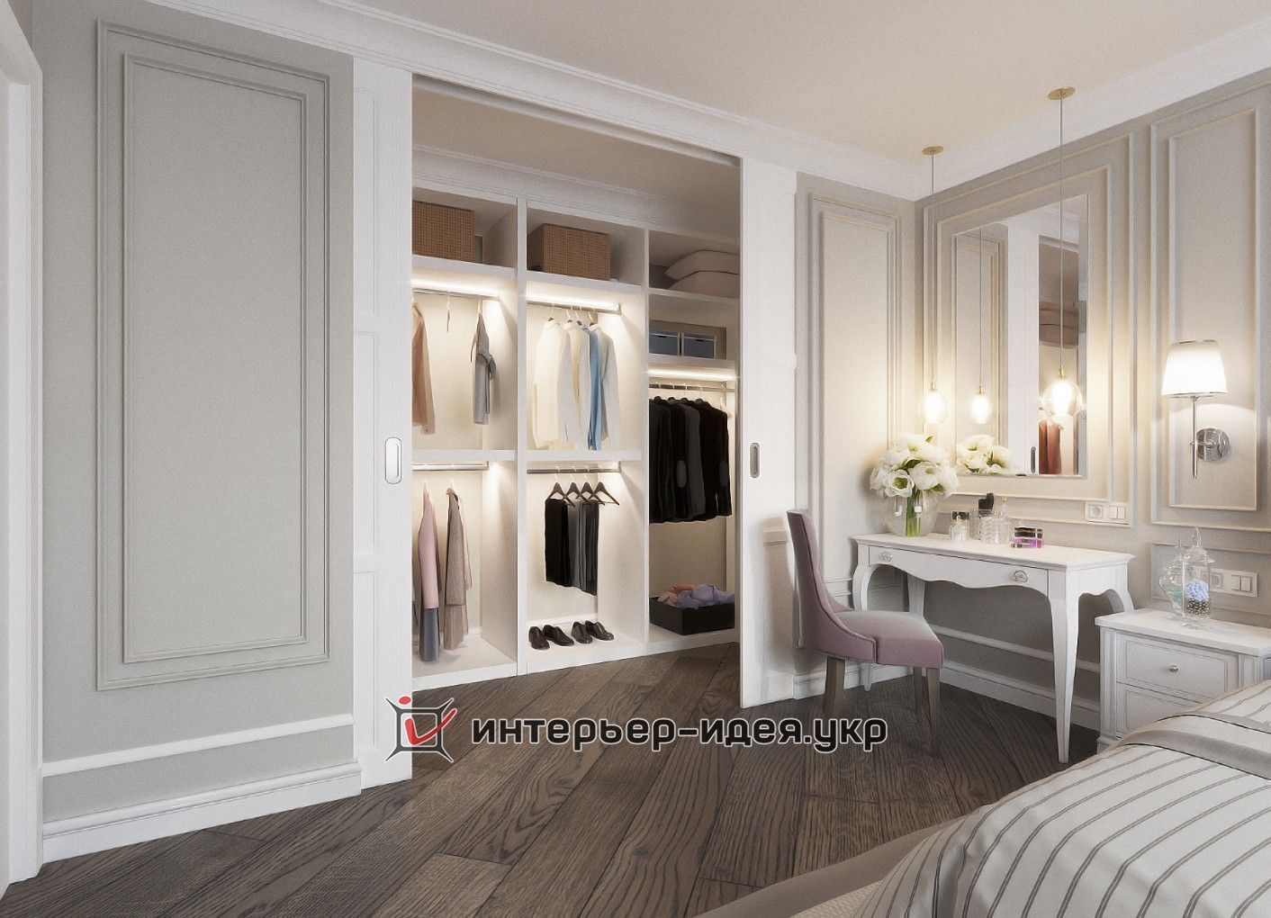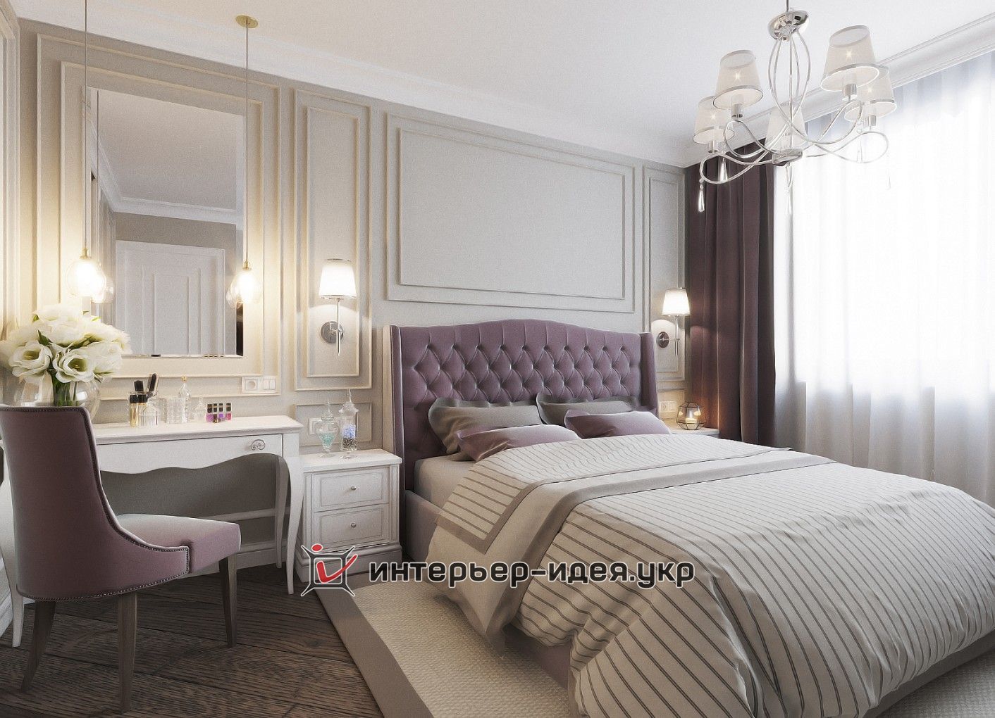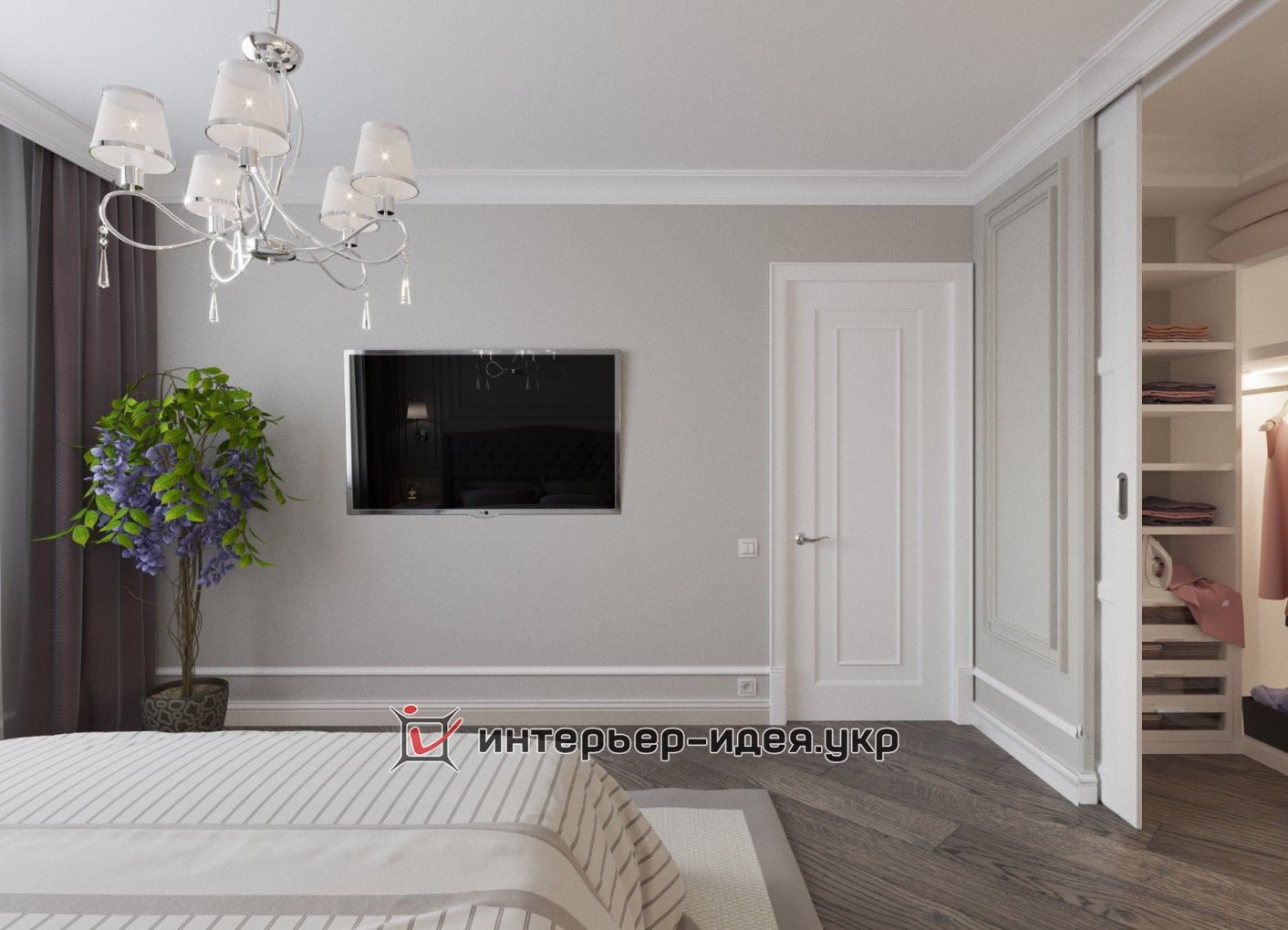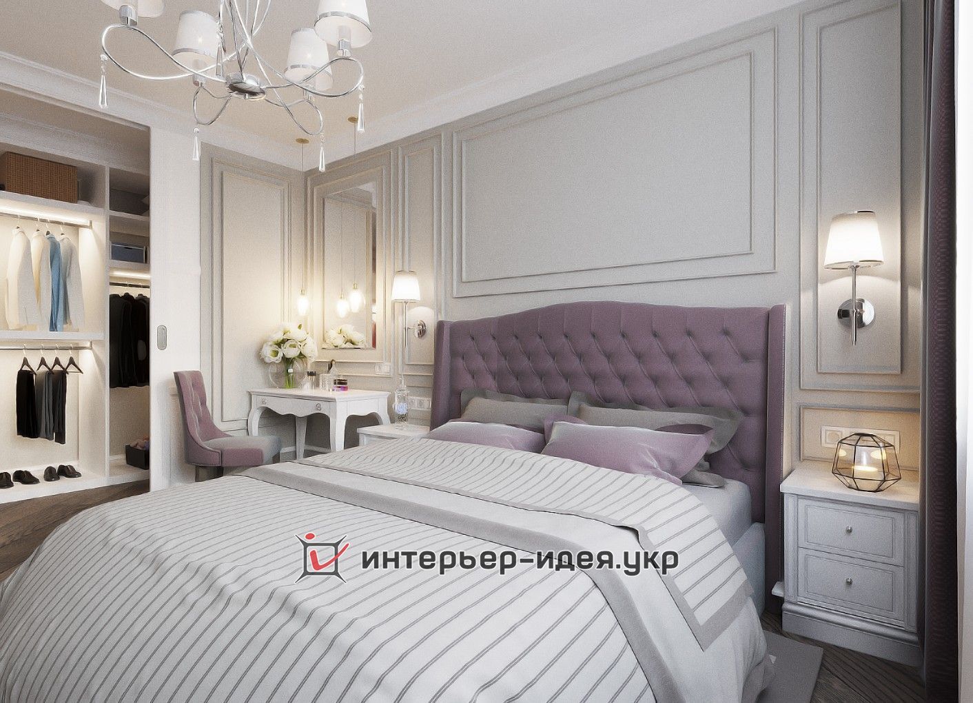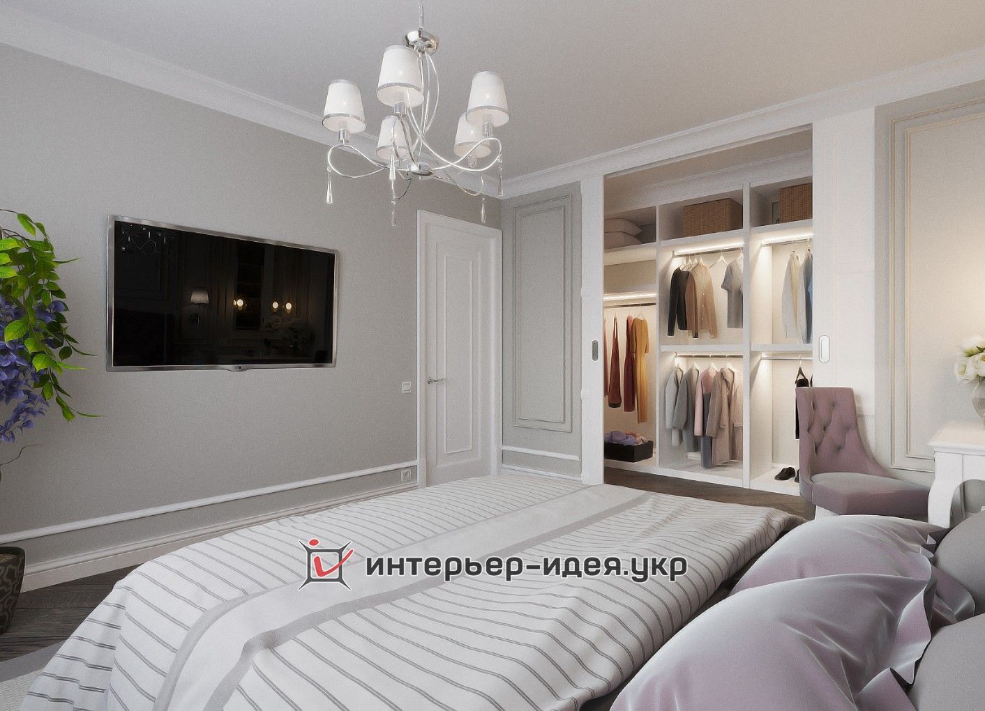 Поєднання в інтер'єрі пастельних і контрастних кольорів Площа спальні дозволила зробити гардеробну без втрати функціональності основної зони спальні. Основну увагу було приділено стінам і текстилю, вони стали центральною частиною інтер'єру. В інтер'єрі використані наступні матеріали: паркетна дошка Parador, люстра і бра Donolux, лепніна Orac.