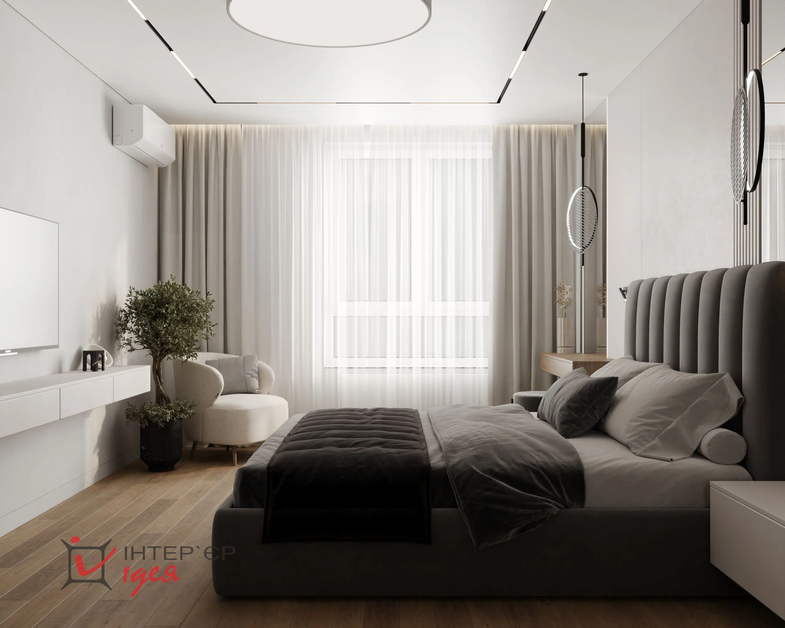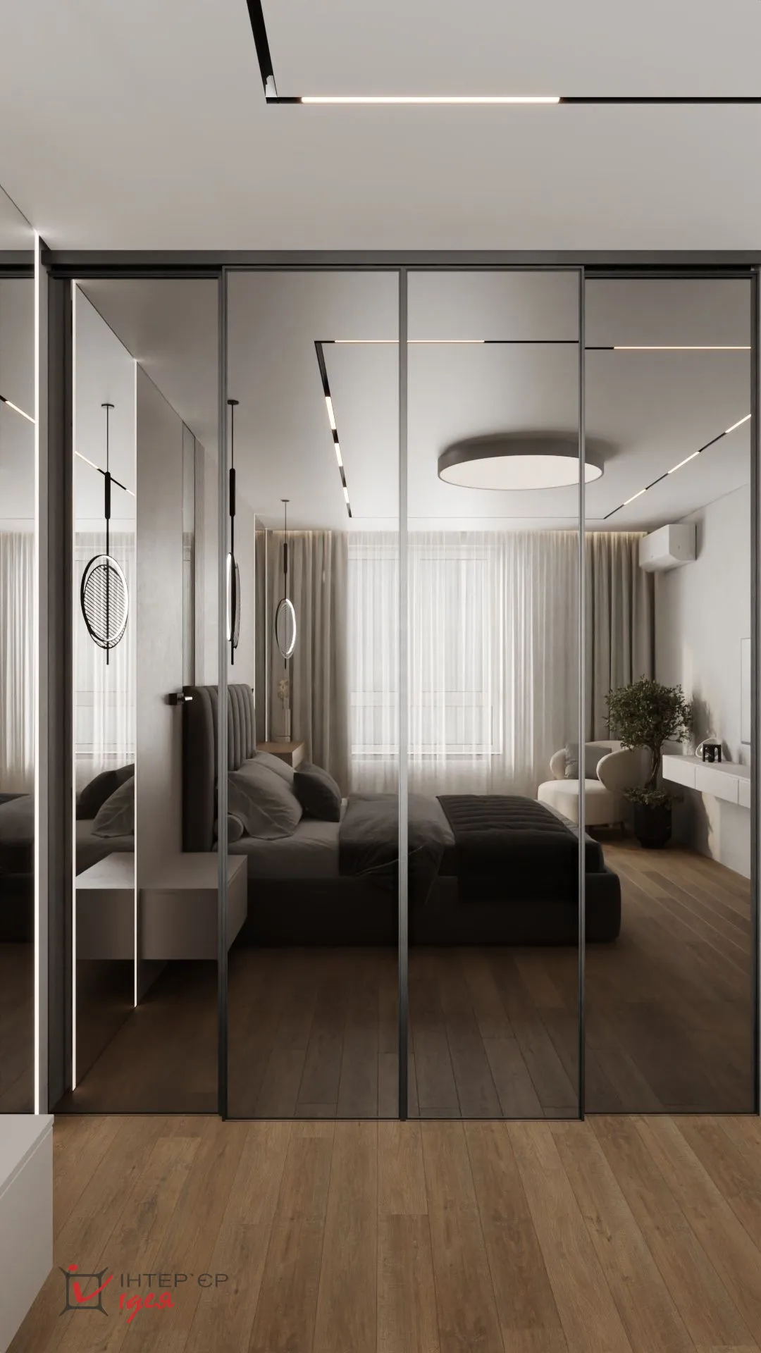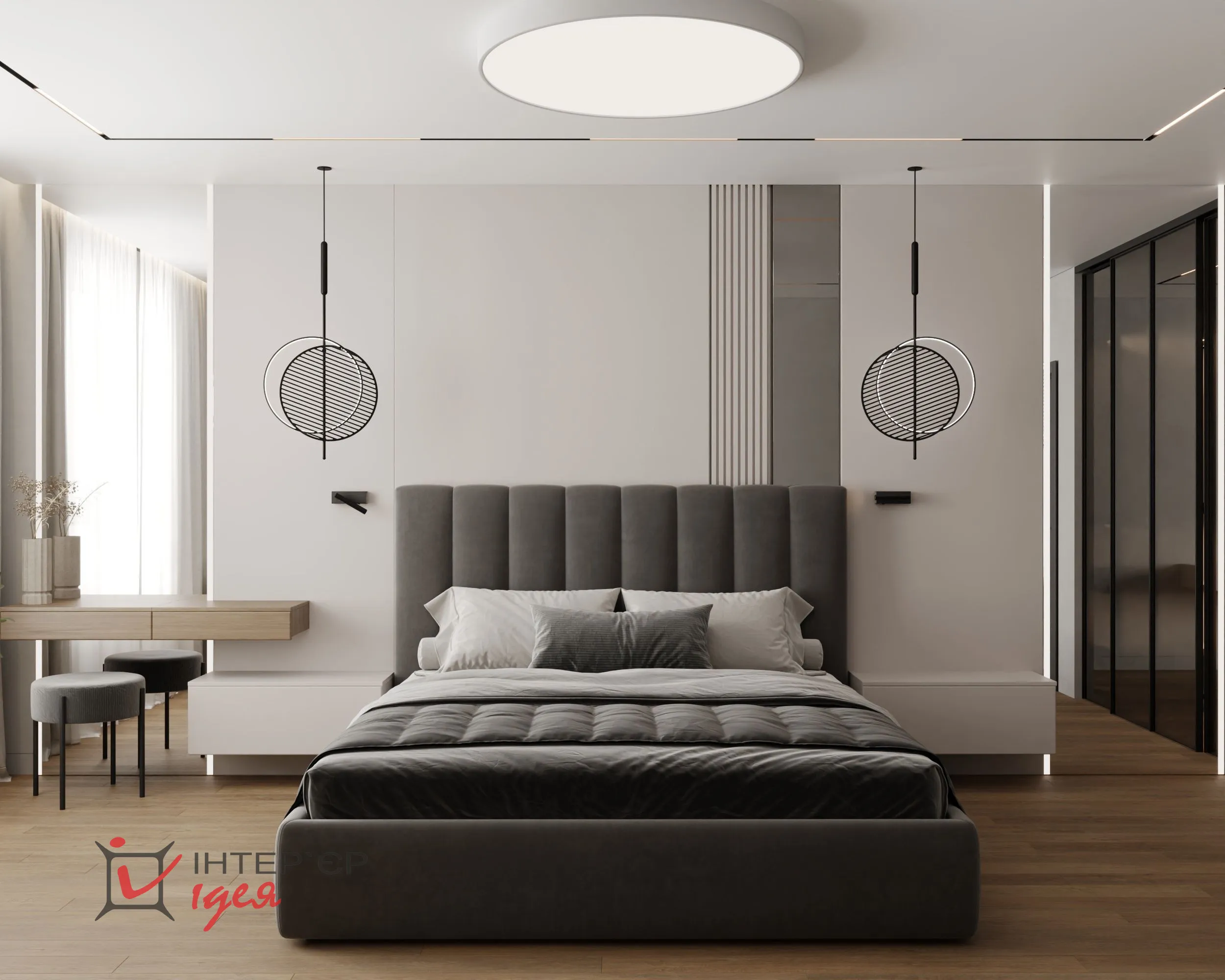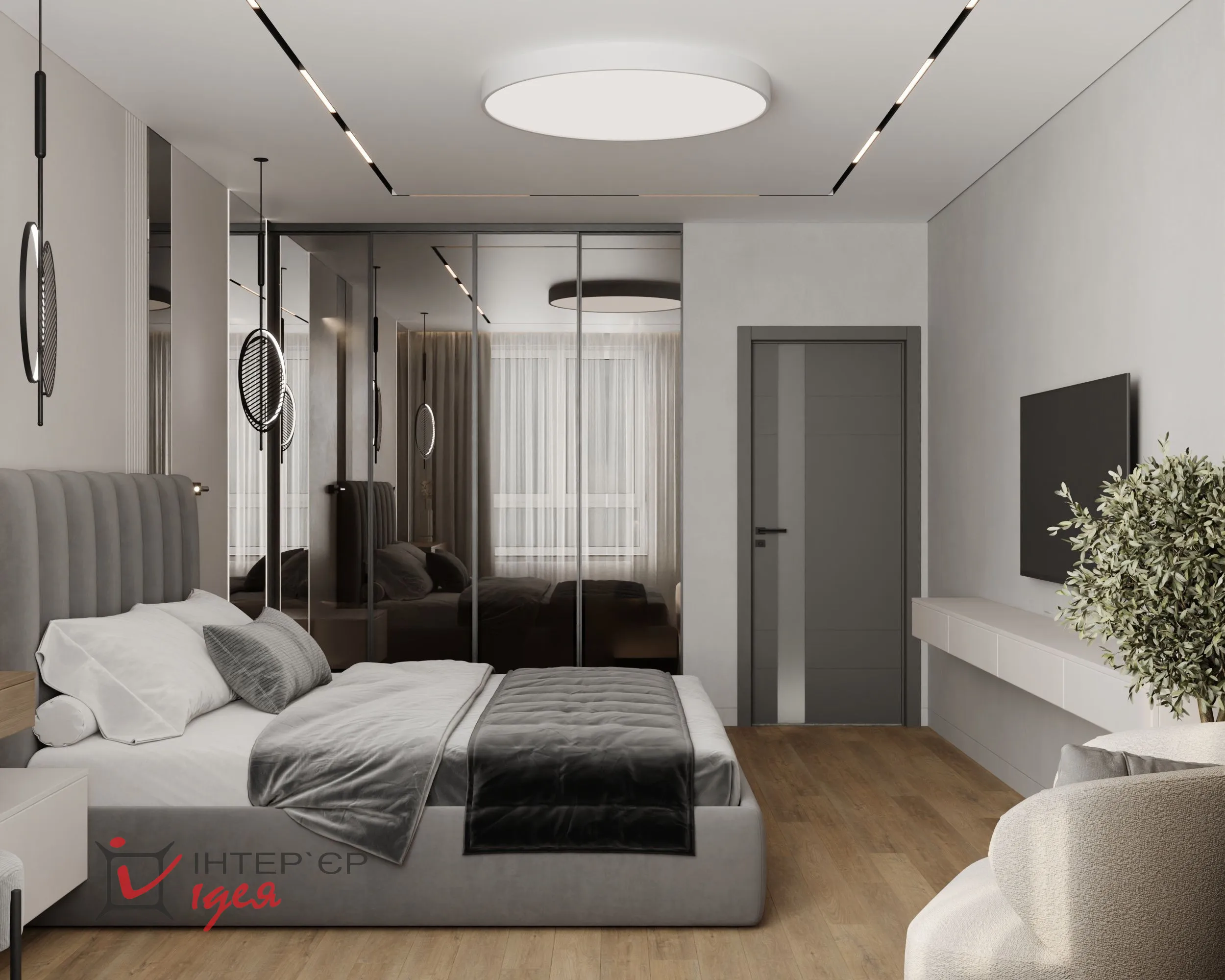 Акцентними й функціональними елементами інтер’єру є дзеркала з підсвіткою, що простягаються від підлоги до стелі та обрамляють стіну за узголів’ям просторого ліжка. Ліжко виконане з м’якої тканини насиченого графітового кольору. Дзеркала також виконують практичну функцію в зоні макіяжного столика і поруч із гардеробом, розташованим за розсувними дверима.