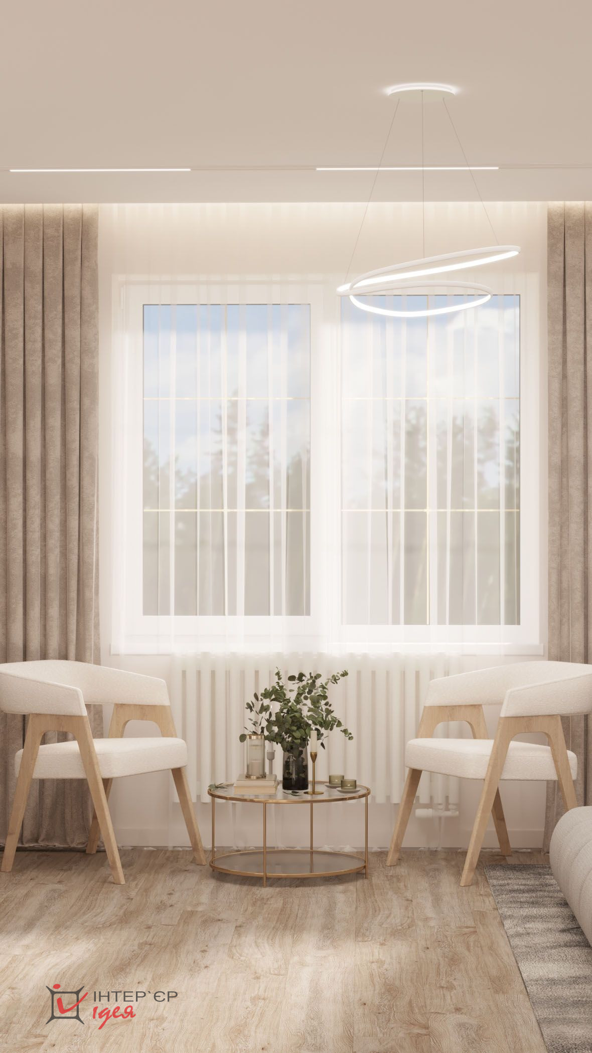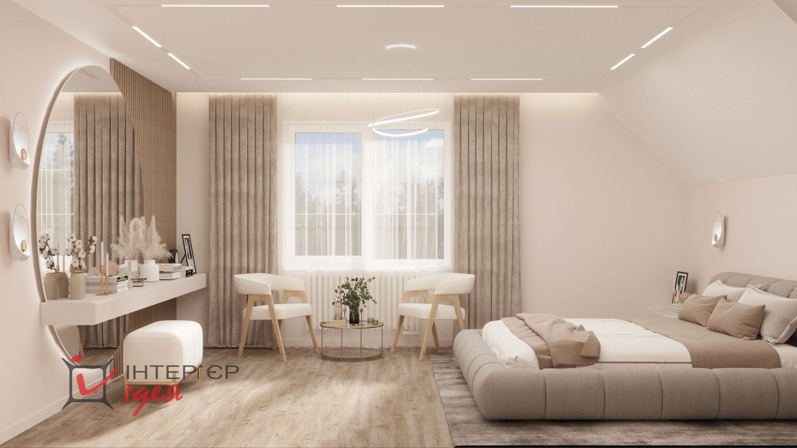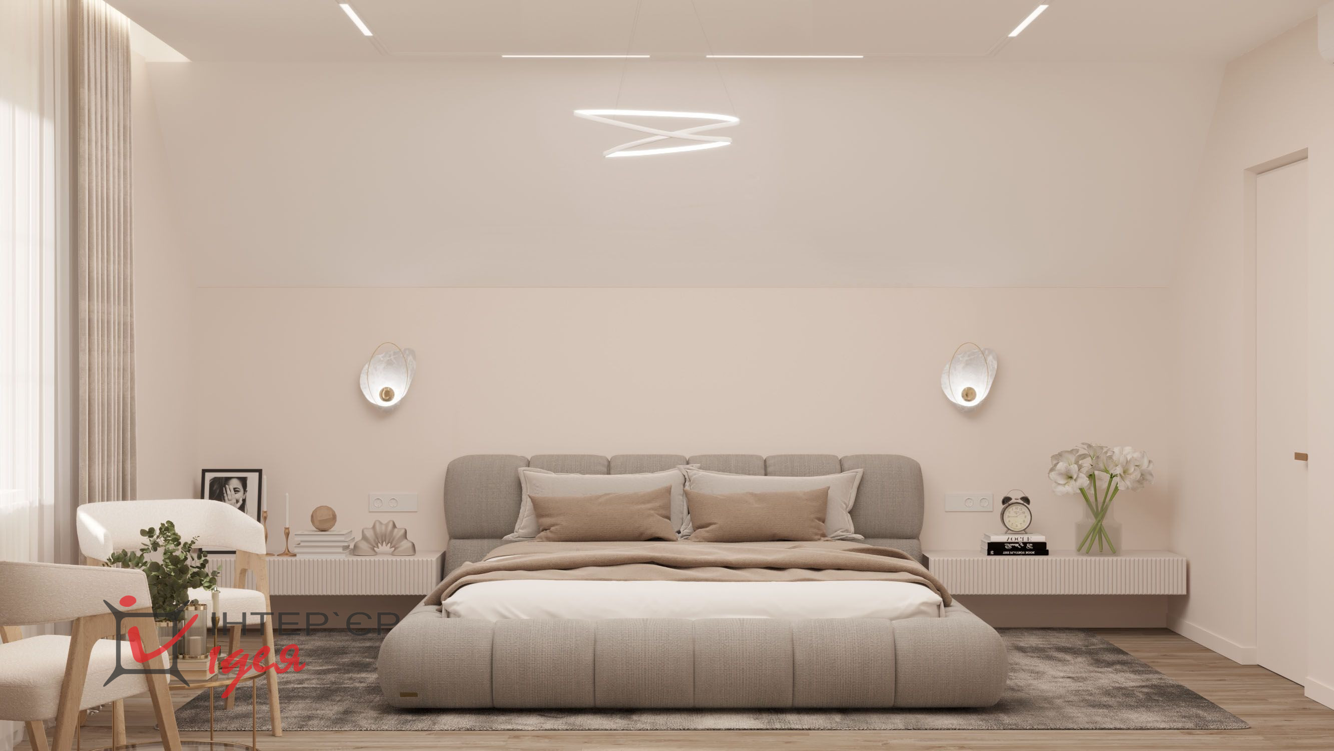 Підвісна консоль виконує роль туалетного столика або декоративної полиці, внизу розташований стильний пуф. Світильники мають плавні округлі форми, які гармонійно вписуються в загальну концепцію. Біля зручного двоспального ліжка з м'яким узголів'ям та підйомним механізмом розташовані дві підвісні тумби. Велике вікно із легкими шторами забезпечує багато природного світла, роблячи спальню затишною та просторою.