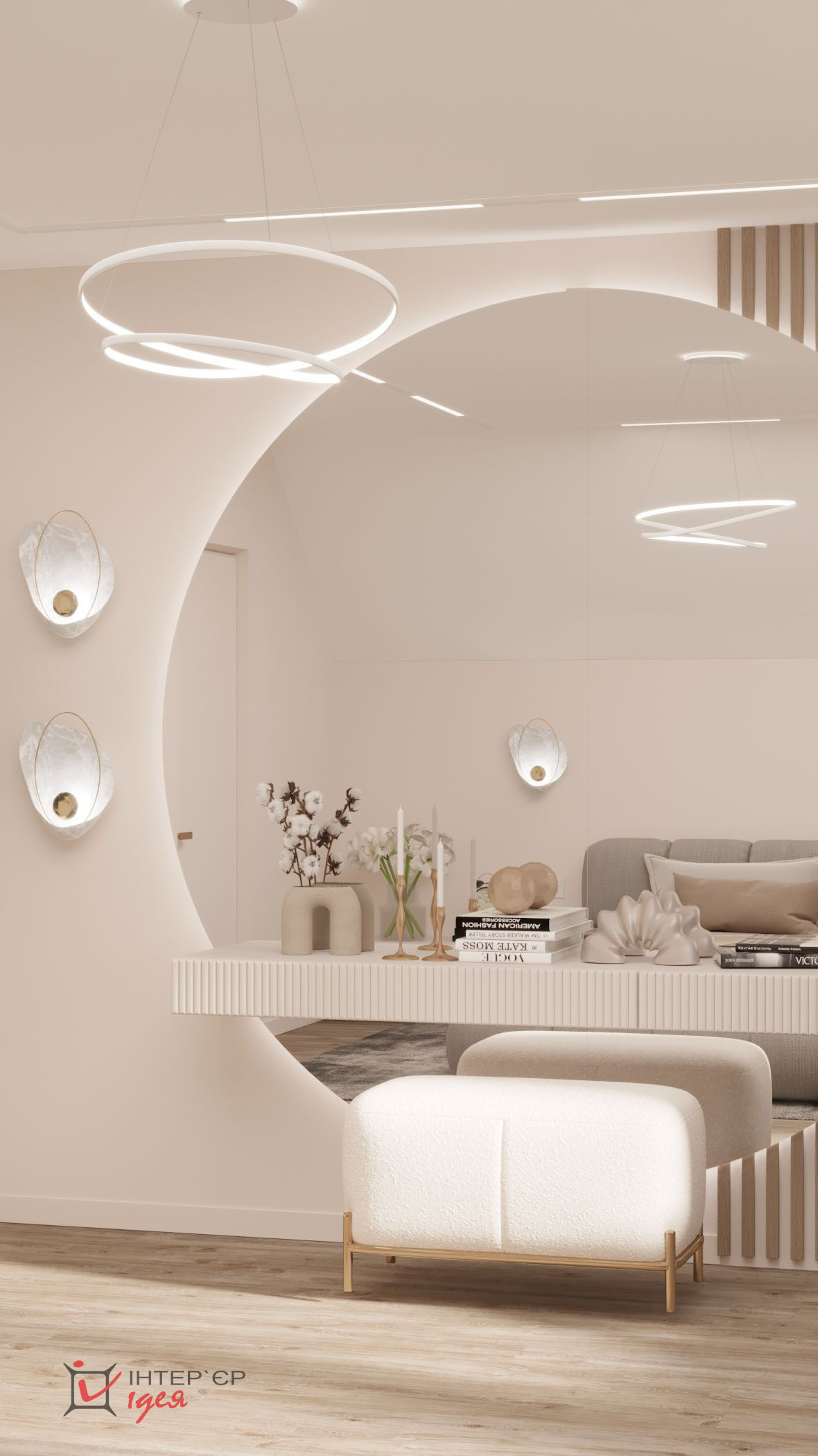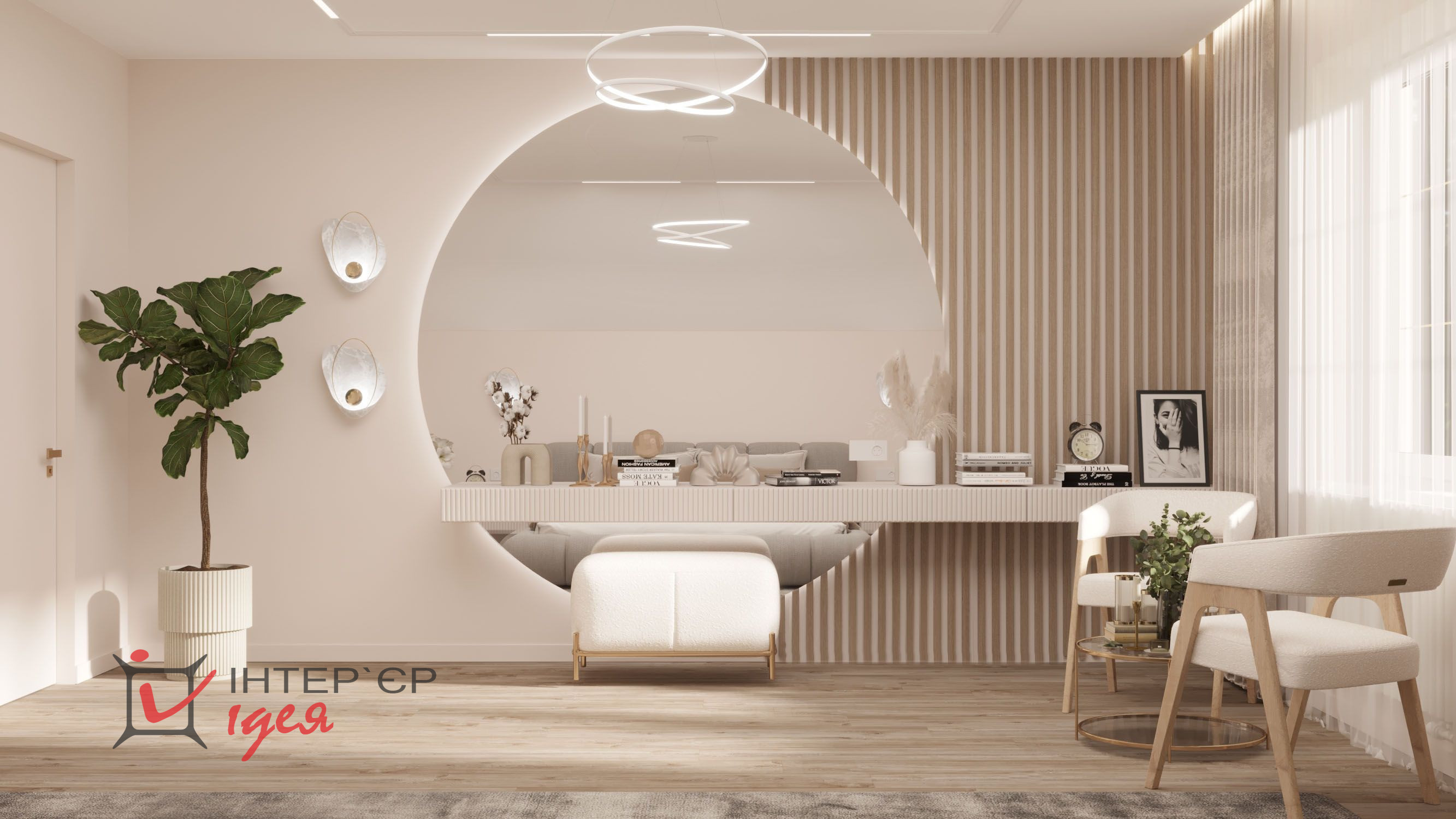 Основу композиції створює велике кругле дзеркало, що візуально розширює простір і додає глибини. Оздоблення стіни дерев'яними панелями з вертикальними смугами надає текстурності й візуального ритму. Домінуючі кольори — кремовий, білий і світло-бежевий — створюють м'яку та спокійну атмосферу спальні.