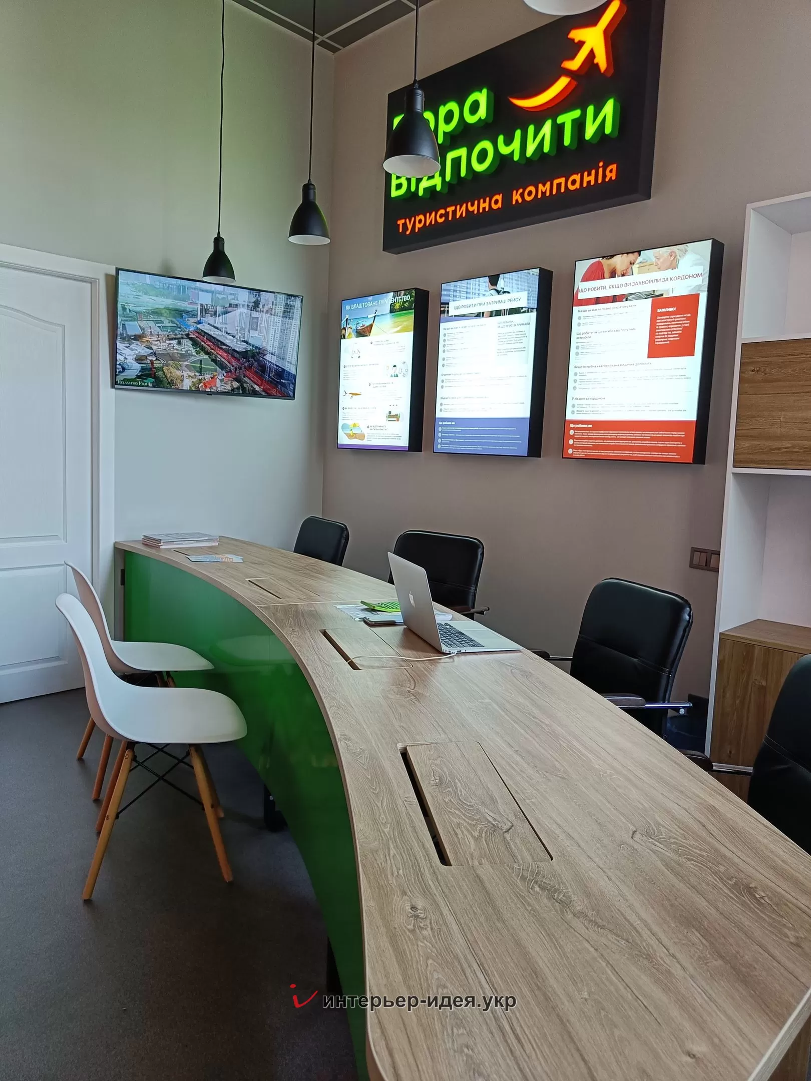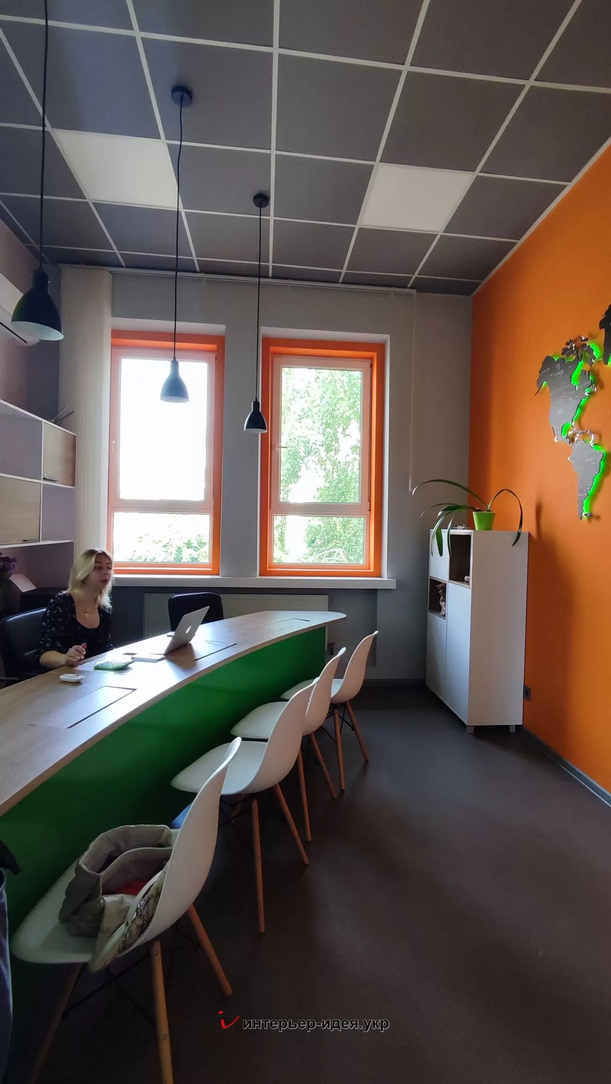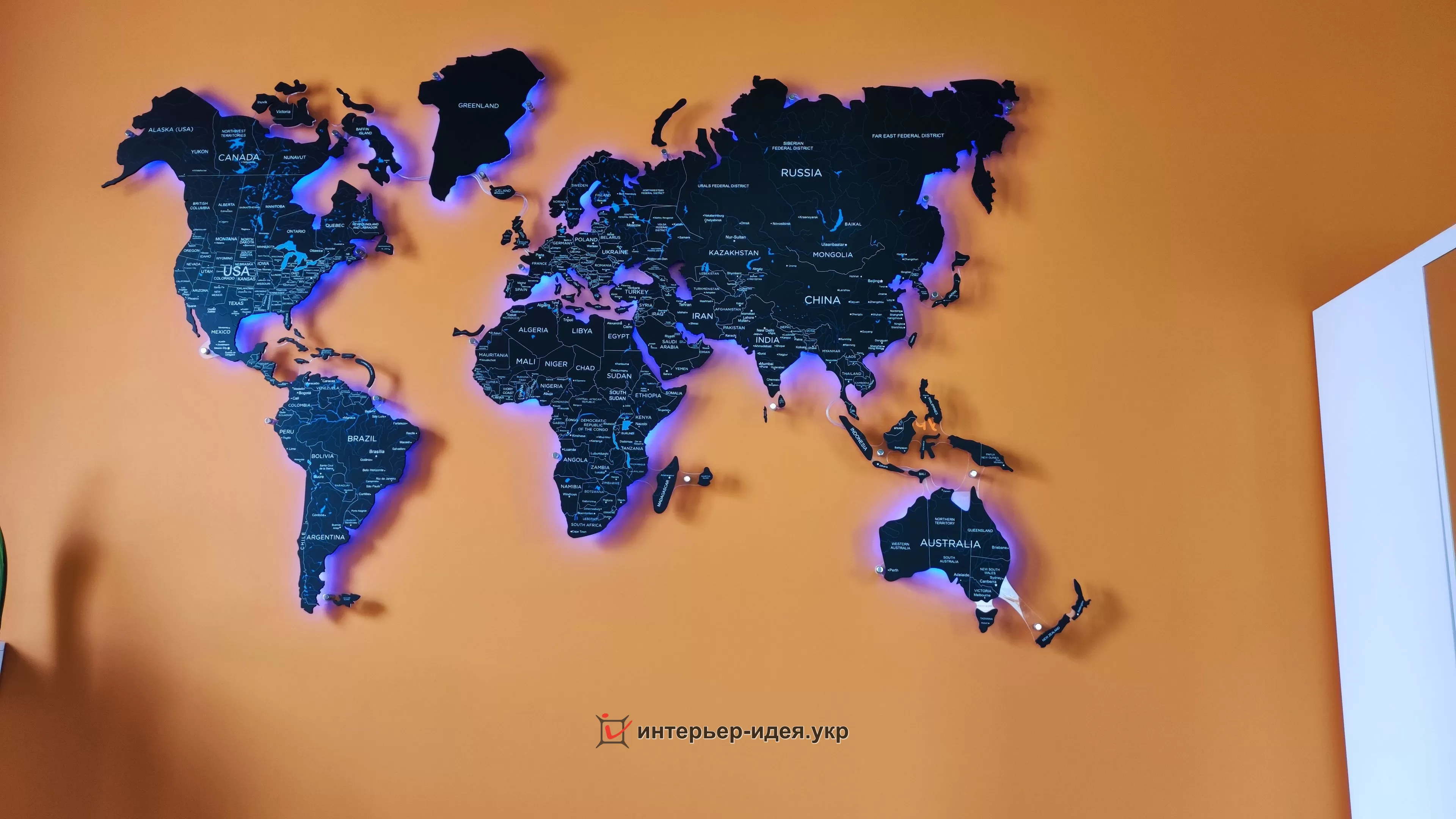 Одну з стін вирішили пофарбувати яскравим кольором, що є цікавим акцентом в поєднанні з контрастною мапою світу чорного кольору та підсвіткою.
