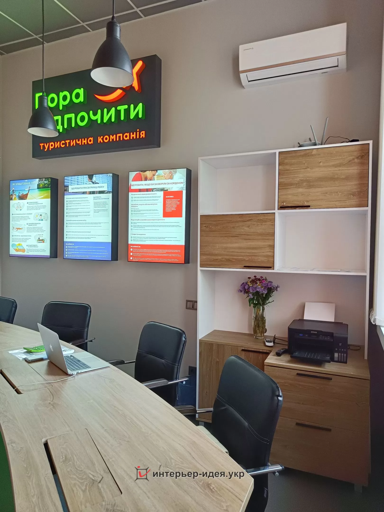 Форму стола обрано з округлими лініями, що дає змогу розмістити 4-х менеджерів з невеликим, але зручним зонуванням кожного працівника зі своїм окремим робочим місцем.